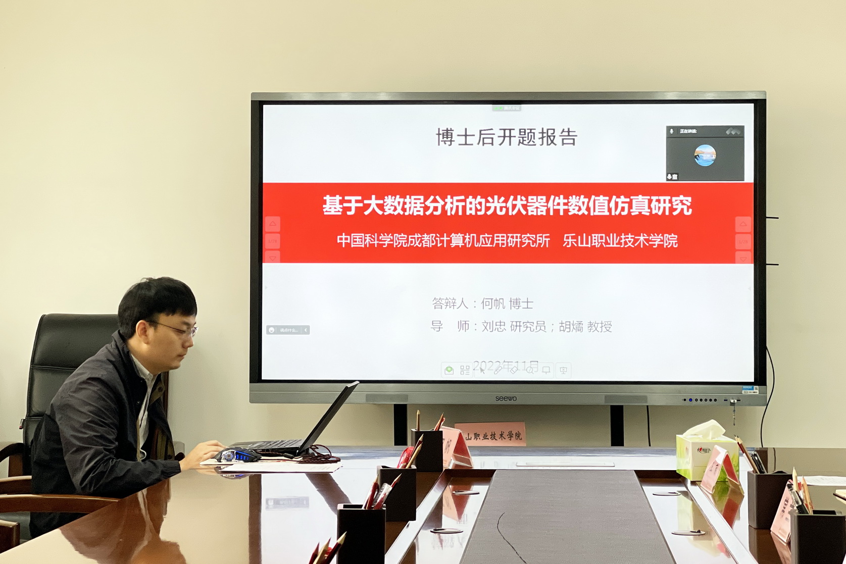 何帆博士的博士后研究课题为“基于大数据分析的光伏器件数值仿真研究”。报告会上,何帆博士详细阐述了课题的国内外研究背景和研究基础,指出了研究的重点和难点,提出了自己的研究思路、解决方法及计划进度等。专家组针对何帆博士汇报内容中的技术路线、可行性和实用性等提出一系列问题并给予了指导性意见。最后,经专家组讨论,一致认为该研究选题能促进硒薄膜太阳电池在光伏建筑一体化、特种电源等领域中的应用,拓展计算机数值仿真及大数据分析在光伏器件中的应用。选题具有创新性,研究目标明确、研究内容丰富,研究方法合理,专家组一致同意开题。