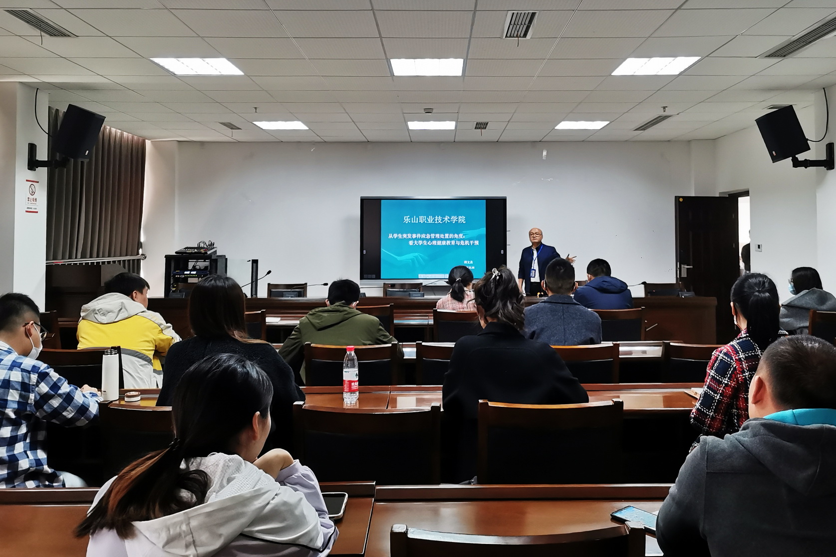 胡文杰向参会辅导员作“从学生突发事件应急管理处置的角度看大学生心理健康教育与危机干预”主题培训。胡文杰首先分析了我院大学生心理健康整体状况,提出影响大学生发生心理危机的影响因素,从心理学角度介绍了一些常见的学生心理危机及表现。分享了心理危机干预的典型案例。