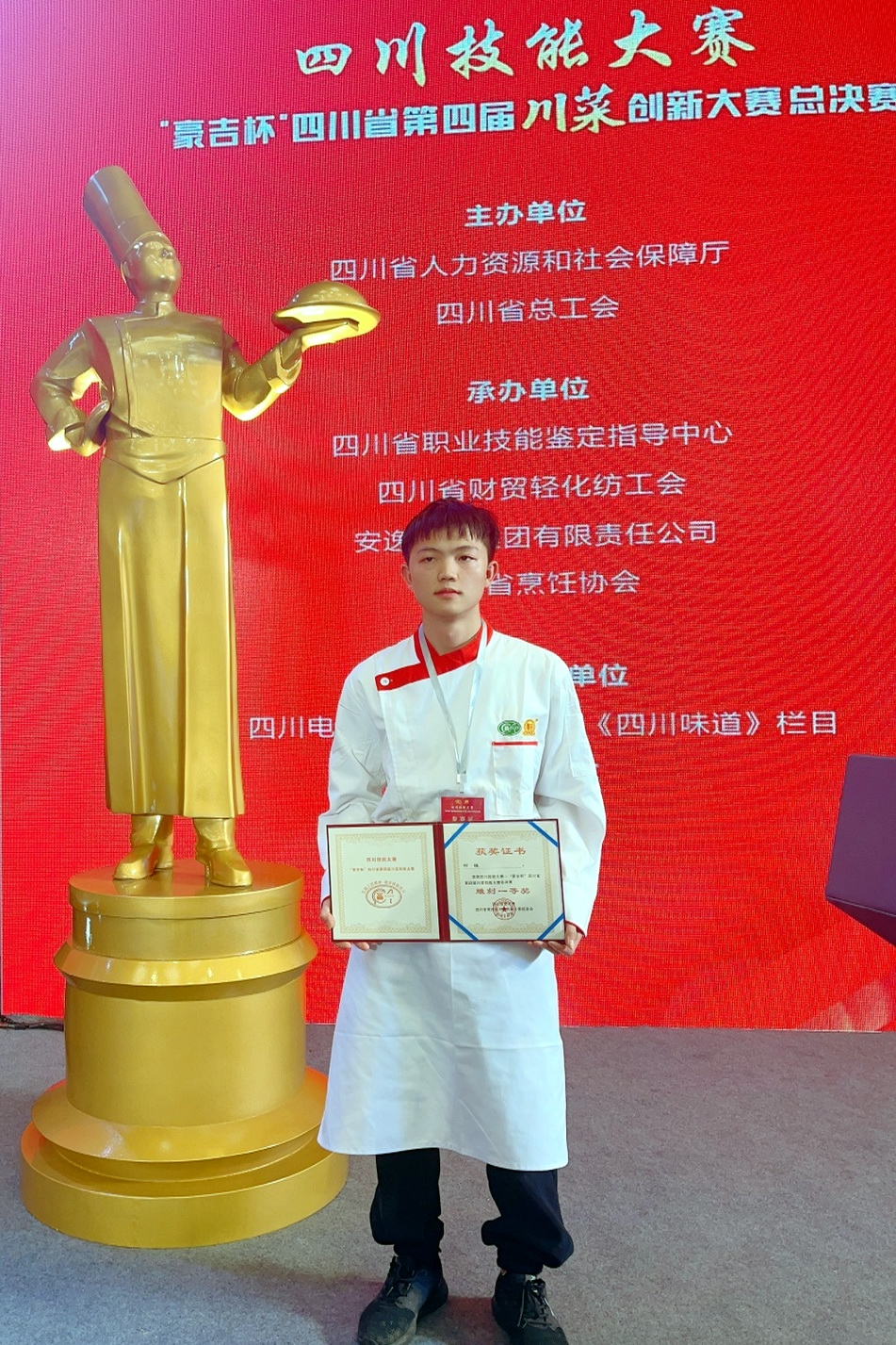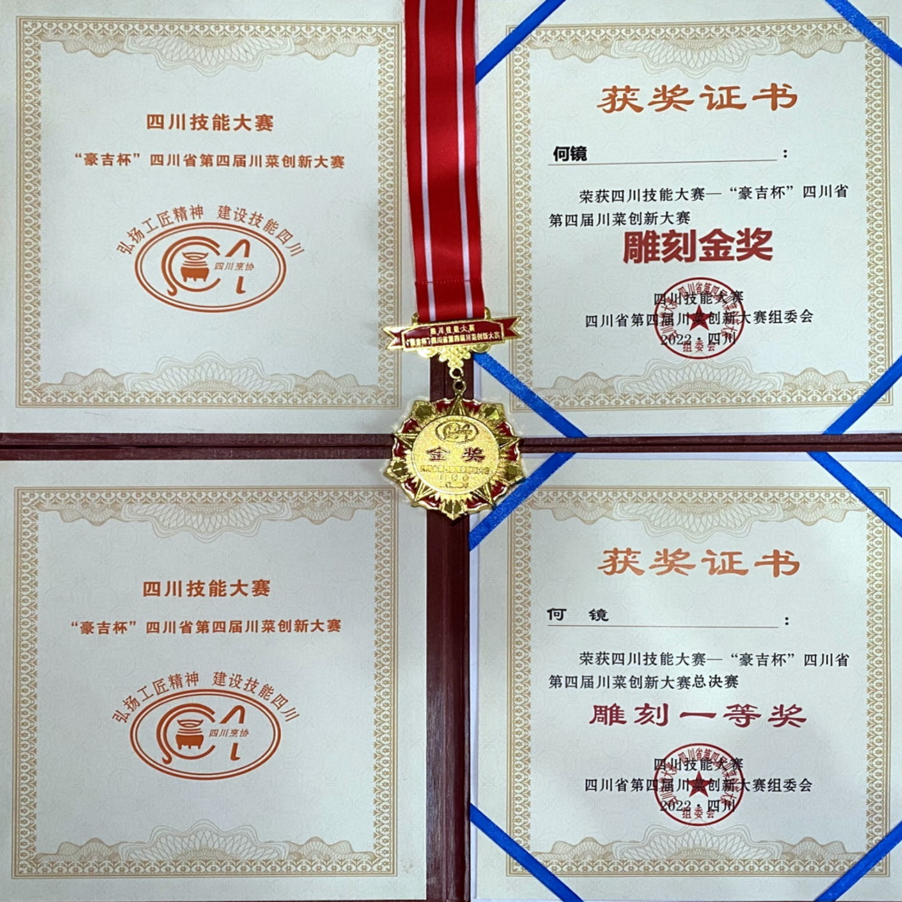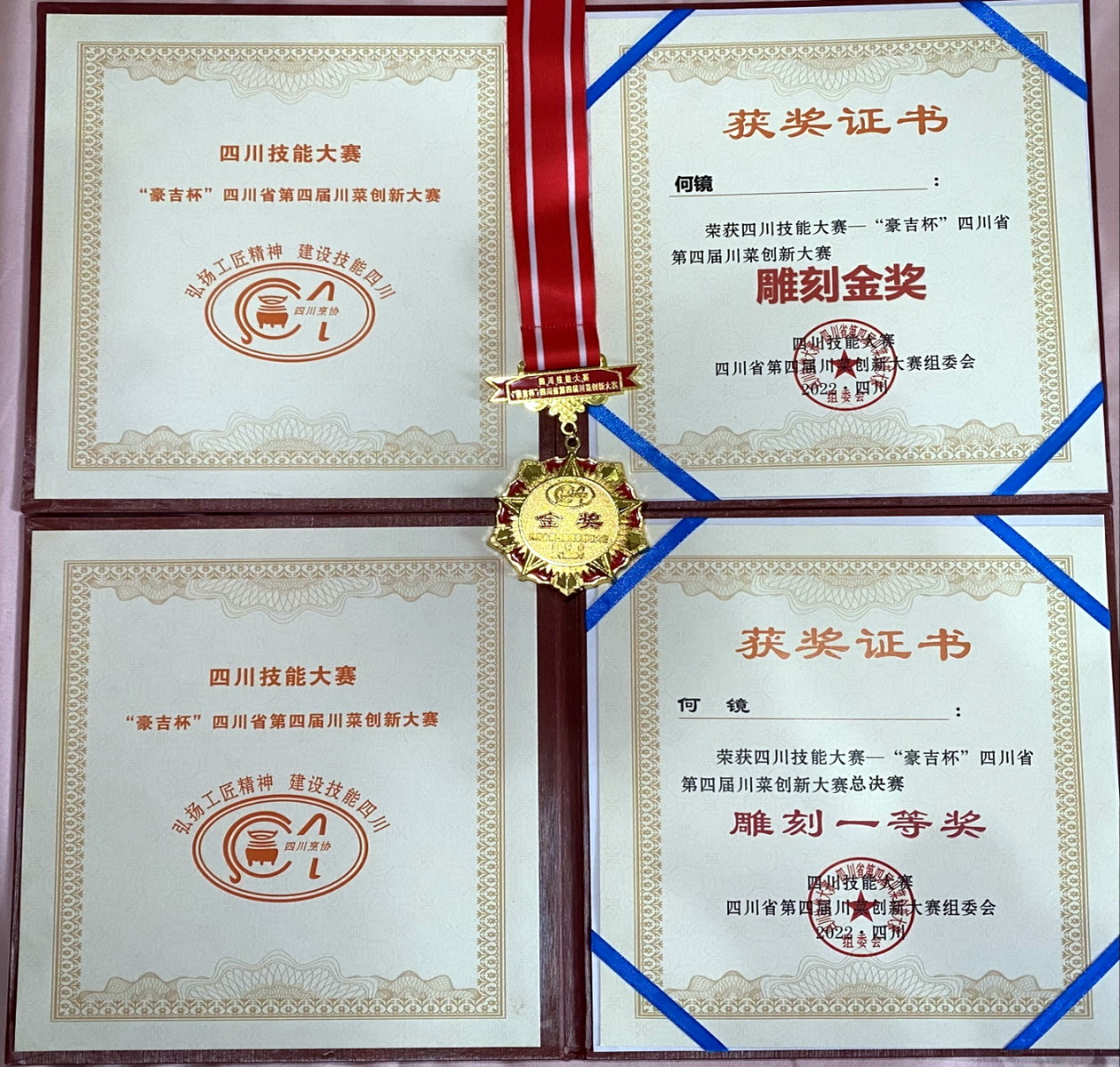 2022年10月28日,四川省一类赛事“四川技能大赛——‘豪吉杯’四川省第四届川菜创新大赛”总决赛在成都举行,sunbet申搏官方网站普专烹饪工艺与营养专业2021级学生何镜斩获食品雕刻赛项省级“一等奖”。