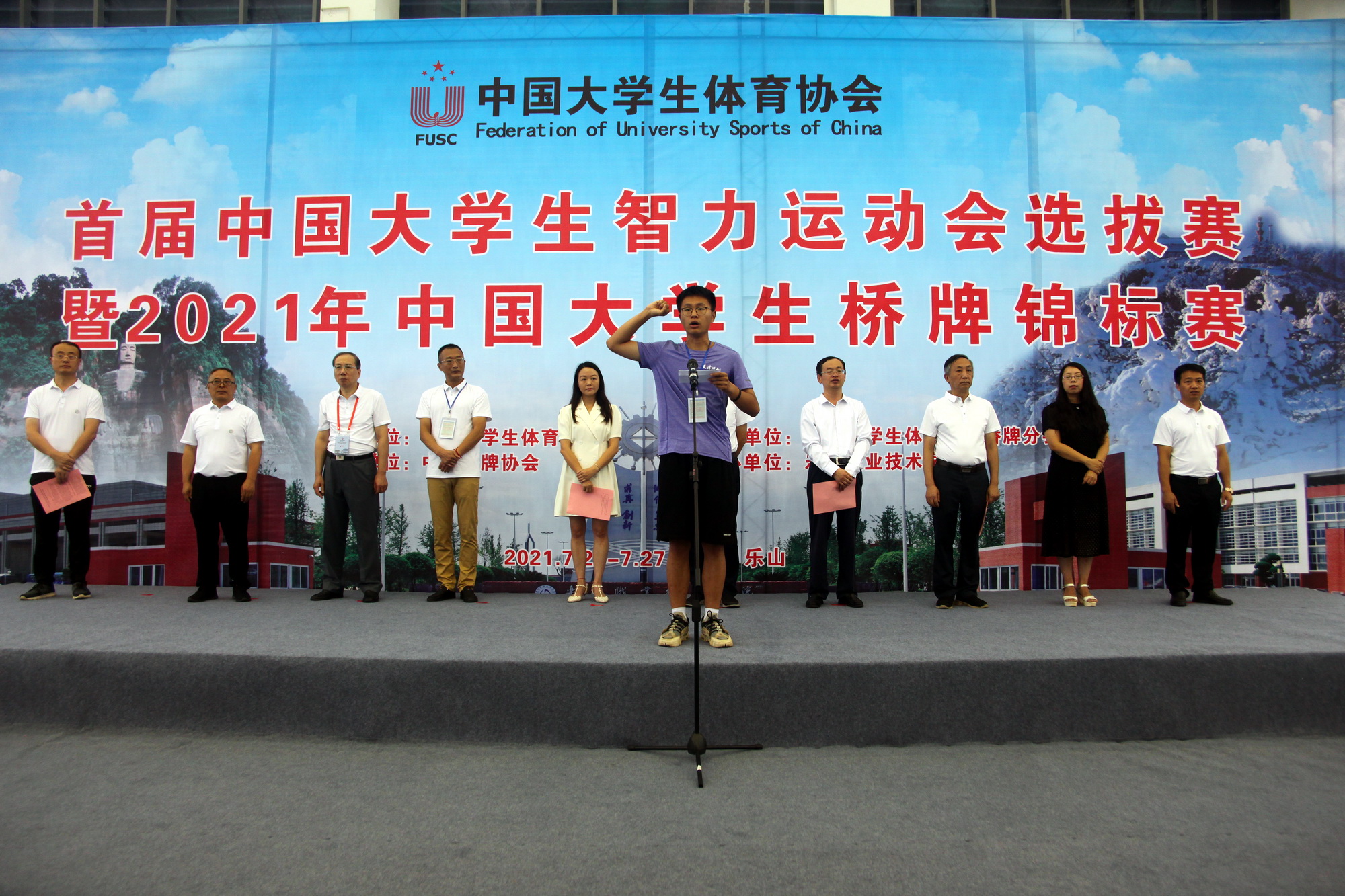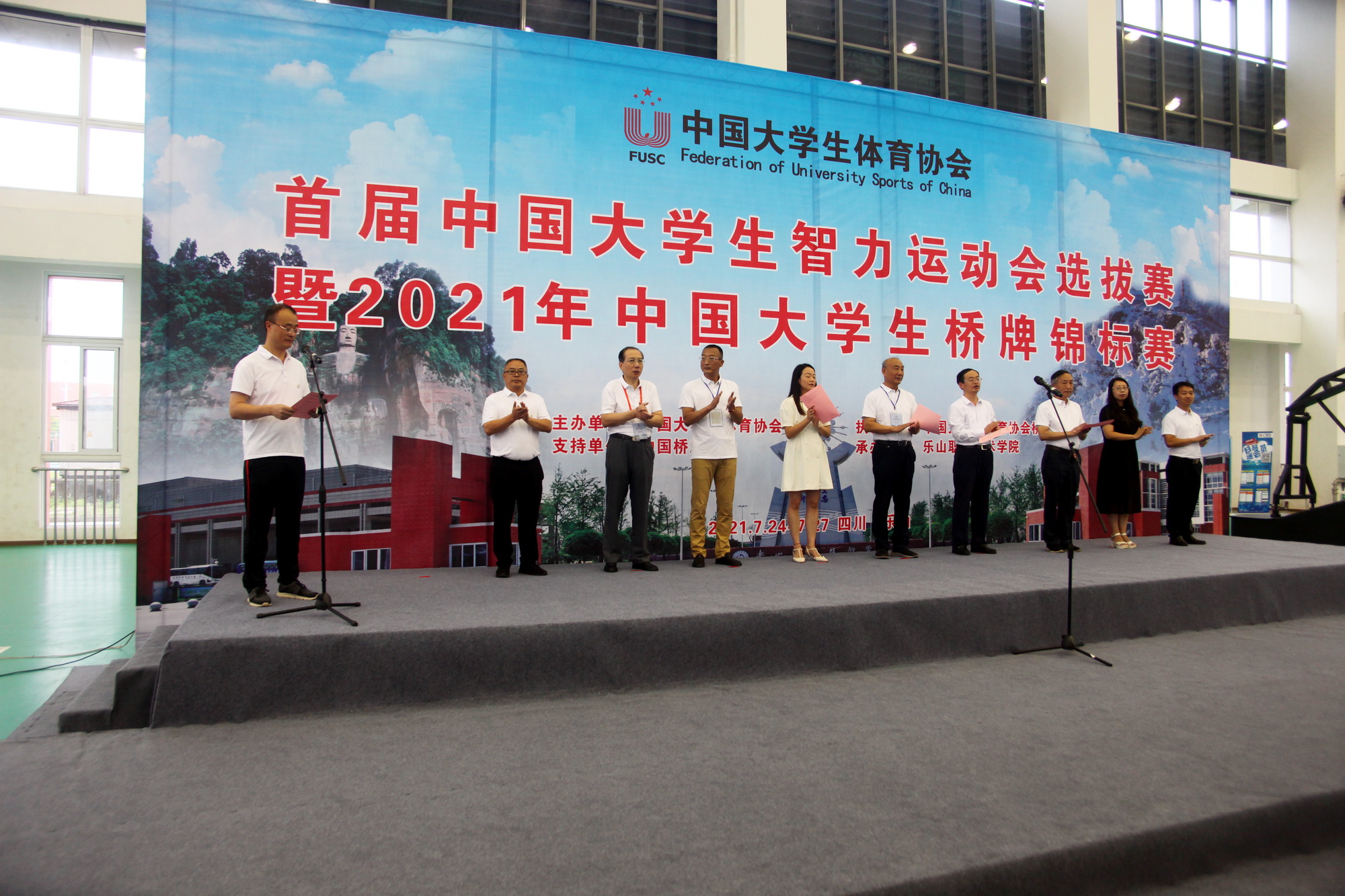 2021年7月24日上午,sunbet申搏官方网站体育馆热闹非凡,首届中国大学生智力运动会选拔赛暨2021年中国大学生桥牌锦标赛在此隆重开幕。中国大学生体育协会桥牌分会主席沈超、中国大学生体育协会桥牌分会副主席蹇路,四川省教育厅体卫艺处副处长江岷霞,乐山市人民政府副秘书长兰守奇,乐山市教育局副局长周芹,学院副院长张学河、封家福等领导参加开幕式。开幕式由sunbet申搏官方网站院长刘忠主持。
