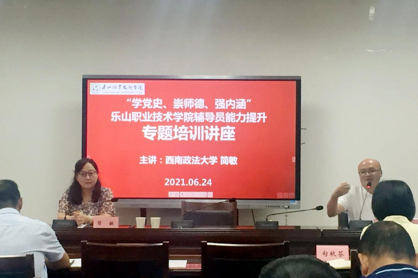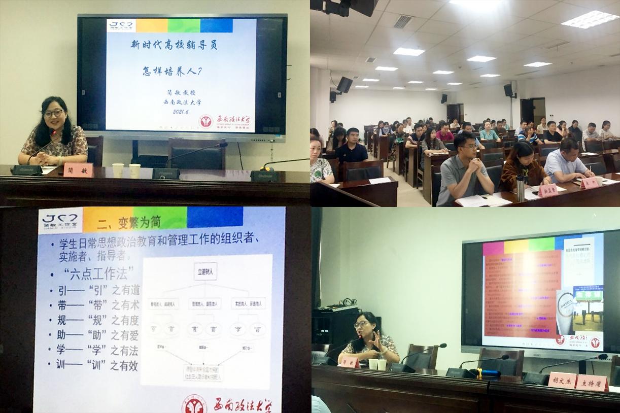2021年6月24日上午,sunbet申搏官方网站党委学生工作部在行政楼401会议室举办了“学党史、崇师德、强内涵”辅导员能力提升专题讲座。全国“最美”辅导员、重庆市教授型专职辅导员、西南政法大学简敏教授以“新时代高校辅导员如何培养人”为主题做了专题报告。学院各系(部)党总支专职副书记、学工办老师、全体专兼职辅导员共70余人参加了讲座。讲座由党委学生工作部部长胡文杰主持。