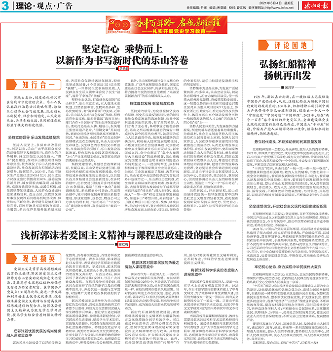 2021年6月4日,《乐山日报》“理论•观点•广告”专栏,刊发了sunbet申搏官方网站马克思主义学院李晓勤、徐红梅老师的两篇署名文章,充分肯定了学院的党史学习研究成果。