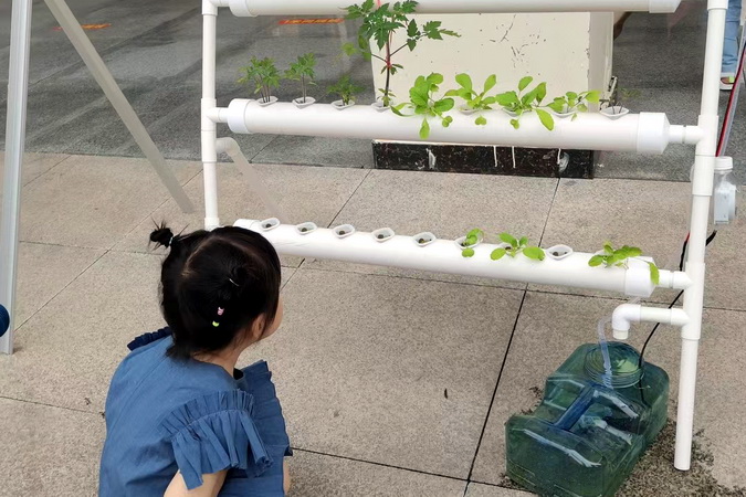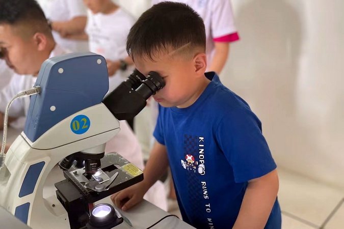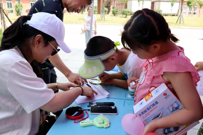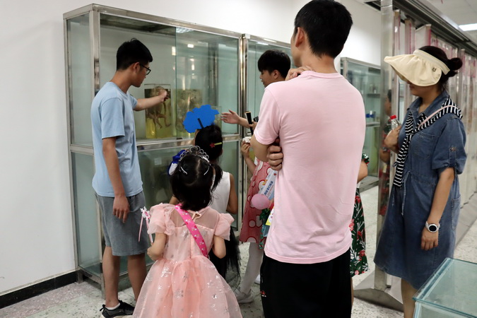 下午三点整,活动正式启动,共计分为四个部分:一是“校园打卡”活动,从图书馆开始,每个小朋友需要集齐图书馆、体育馆、主运动场、升旗台、教学楼、5号实训工厂六个印章才能兑换一份礼物;二是“走近科学、职业体验”活动,包括“参观体验光伏发电小产品”“手工美术”“参观中国革命史馆”“显微科普--植物表皮细胞观察”“参观人体科学馆、观察微生物、急救知识科普”“儿童安全科普动画教育;参观工业机器人系统实训中心及科普介绍”六个场馆,供教职工和子女自由参加。此时的校园人头攒动,近百名大学生志愿者分散于各打卡点和展厅接待教职工和子女,欢声笑语不绝于耳。