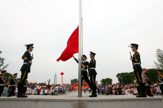 5点10分,自由活动结束,教职工和子女一同汇聚于明德广场,参加升旗仪式。在雄壮的国歌声中,所有在场人员高唱国歌,目送五星红旗冉冉升起,将整场活动推向了最高潮。