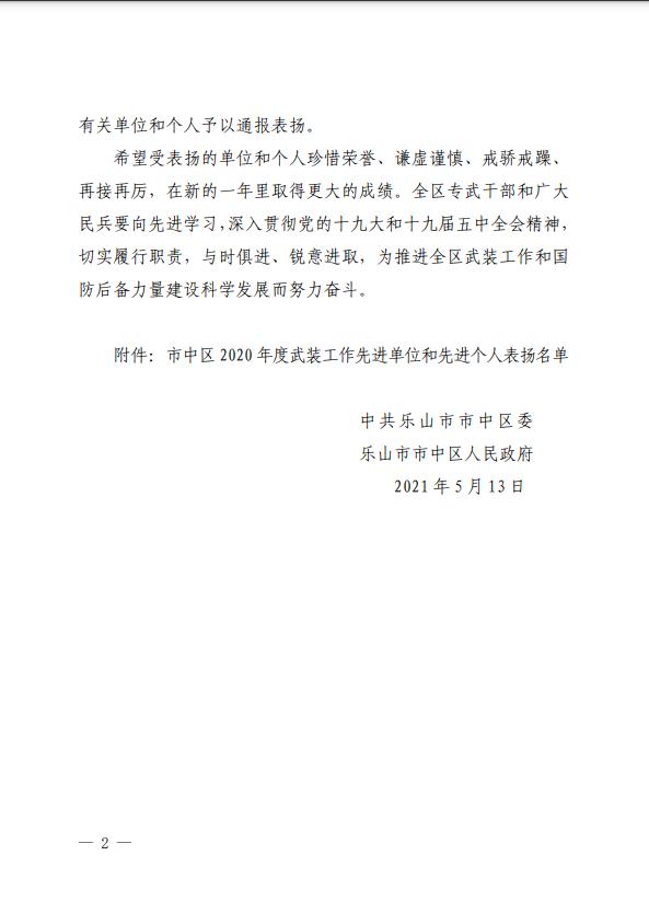 5月13日,乐山市市中区委、区政府下发《关于表扬2020年度武装工作先进单位和先进个人的通报》文件。文件表扬了在2020年圆满完成了民兵军事训练、全民国防教育、兵员征集、抢险救灾、安保维稳等武装工作任务,在年度武装工作中涌现出的先进单位和先进个人。