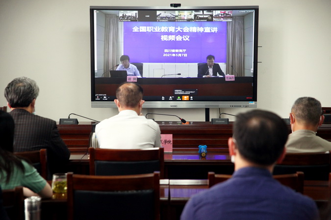 2021年5月7日上午,全国职业教育大会精神宣讲会在成都召开,教育部职业教育与成人教育司副司长谢俐在四川省教育厅主会场进行了宣讲。学院院领导、全体中层干部、部分教师代表在行政楼401会议室参加了这场视频会议。