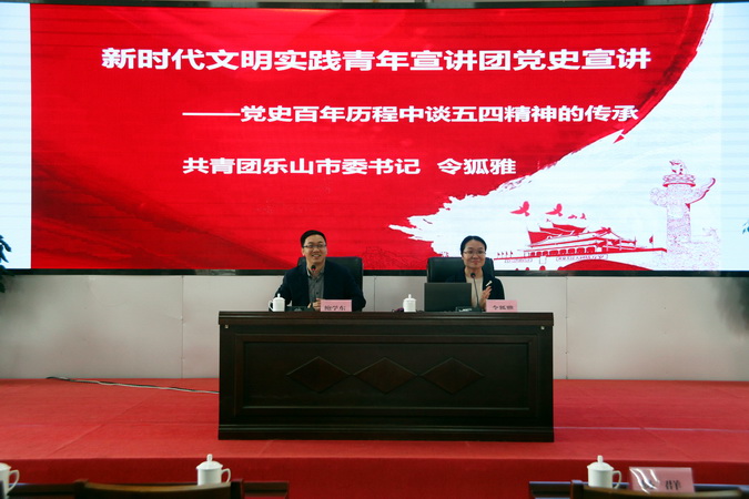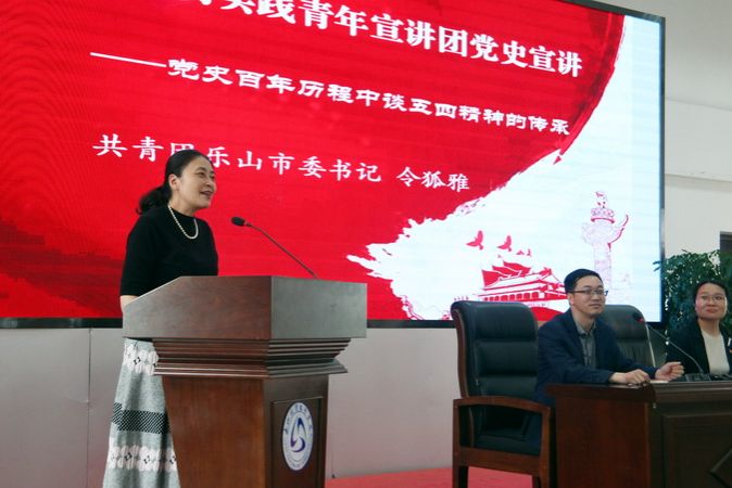 今年是中国共产党成立100周年,为深入开展党史学习教育、学习贯彻习近平总书记在清华大学考察时重要讲话精神,4月28日,新时代文明实践青年宣讲团“百人千场”宣讲活动走进sunbet申搏官方网站,乐山市新时代文明实践青年宣讲团召集人、共青团乐山市委书记令狐雅围绕《党史百年历程中谈五四精神的传承》的主题为sunbet申搏官方网站“青马工程”(青年马克思主义者培养工程)培训班的学员和教师代表共200余名师生开展党史学习教育专题宣讲。本次宣讲由sunbet申搏官方网站副院长鲍学东主持,学院党委书记易群参加。