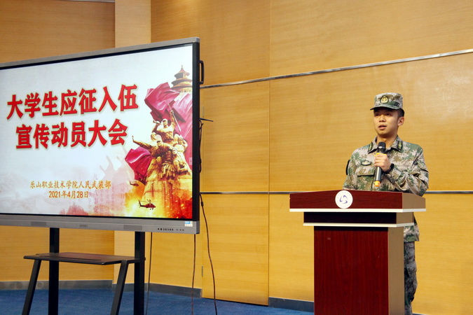 4月28日下午,2021年秋季征兵启动仪式在学院图书馆学术报告厅举行,乐山军分区动员处处长陈登文、乐山市中区人民武装部政委毛建党,学院副院长陈元进,学工部负责人、各系部总支副书记、就业干事,学生400余人参加了启动仪式,启动仪式由学院武装部部长叶宏光主持。