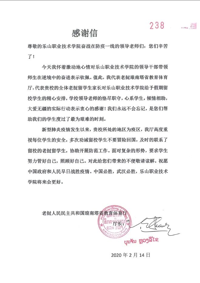 如果说疫情是一场没有硝烟的战争,那张晶晶老师也是其中的“逆行者”。疫情期间sunbet申搏官方网站就收到来自老挝琅南塔省教育厅、世界越南柬埔寨老挝(亚洲)华人团体联合会等单位的慰问和肯定。