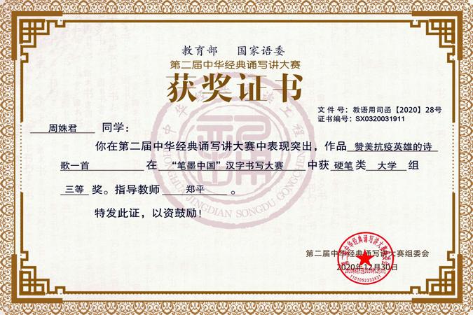 近日,在由教育部、国家语委主办的第二届中华经典诵写讲大赛中,学院护理系普专口腔护理18-1班周姝君同学的硬笔书法作品,荣获 “笔墨中国”汉字书写大赛三等奖。