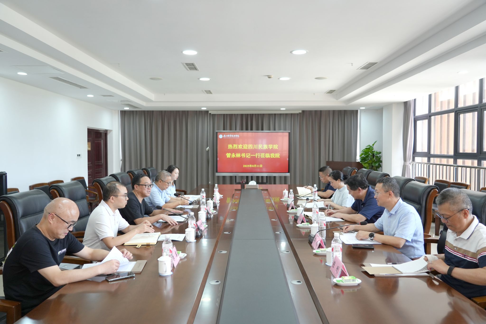 2025年8月11日,四川民族学院党委书记管永林一行莅临申搏官网,围绕新校园建设工作开展专题学习交流。党委书记成定彬,党委委员、副校长张学河及相关部门负责人陪同交流。