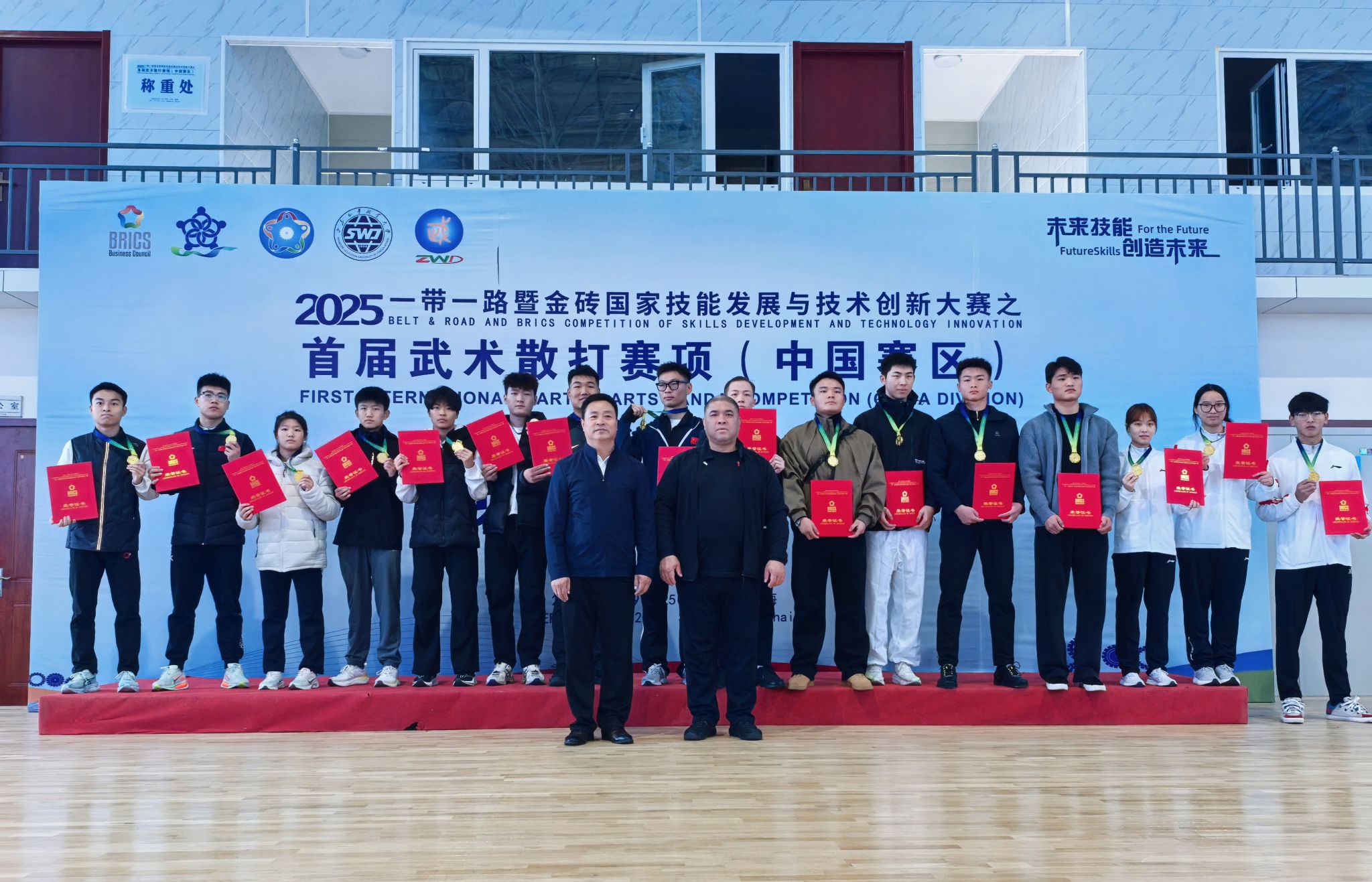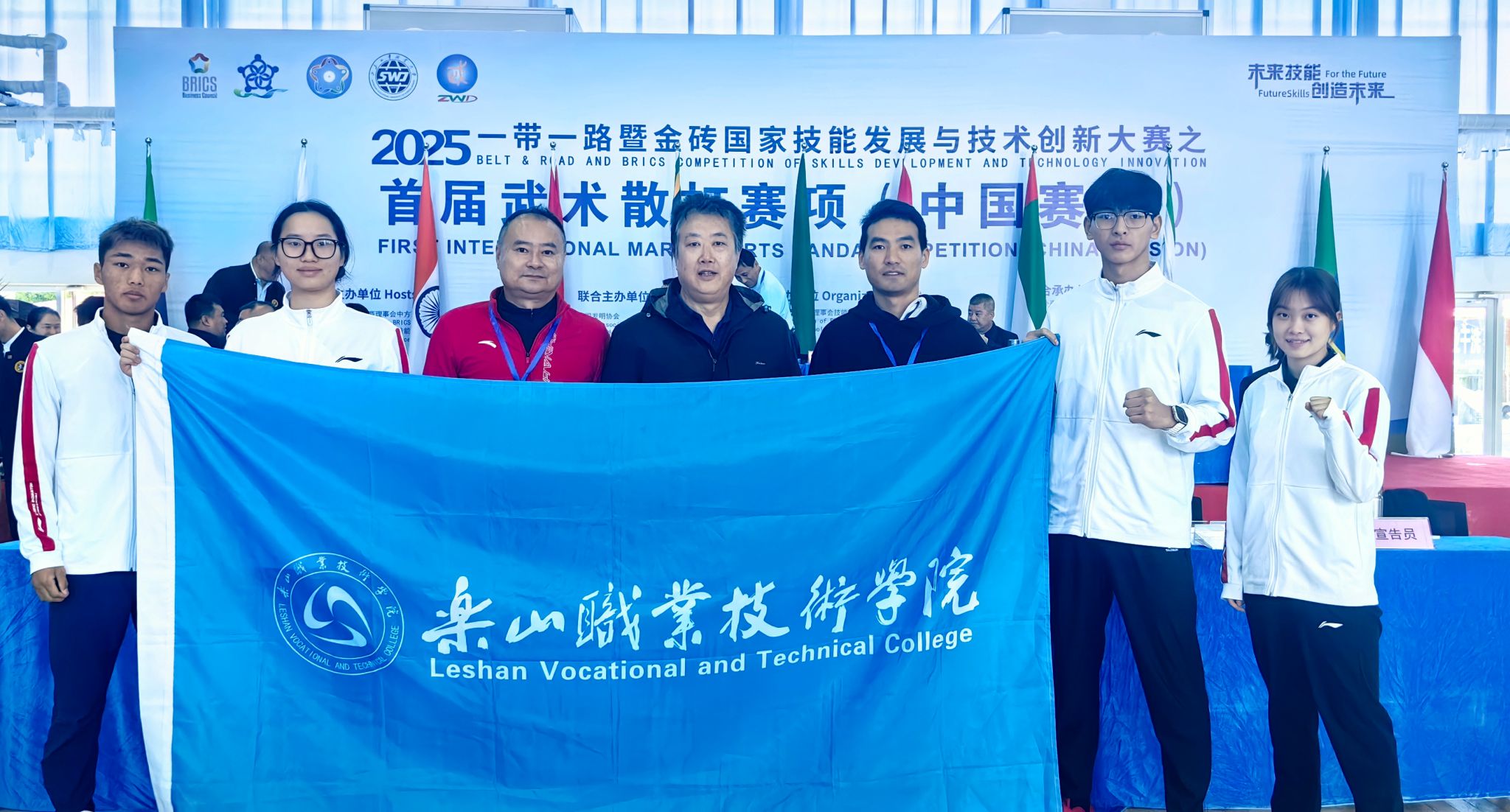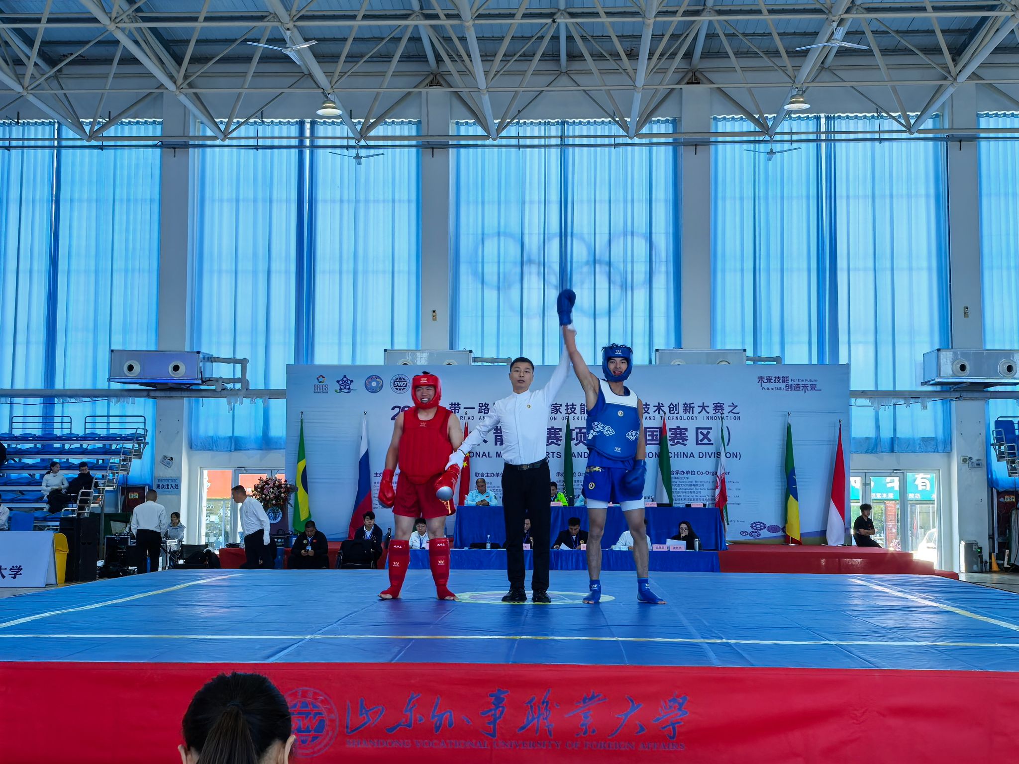 10月19日-25日,2025“一带一路”暨金砖国家技能发展与技术创新大赛之首届武术散打赛项在山东外事职业大学(威海校区)隆重举行。本次大赛由金砖国家工商理事会中方理事会、“一带一路”暨金砖国家技能发展国际联盟等机构共同主办,山东外事职业大学等单位联合承办,吸引了全国55所院校的381名运动员、领队及指导教师齐聚赛场,以武会友、以技切磋,充分展现新时代高校学子的竞技风采,是全国武术散打领域的一次盛会。