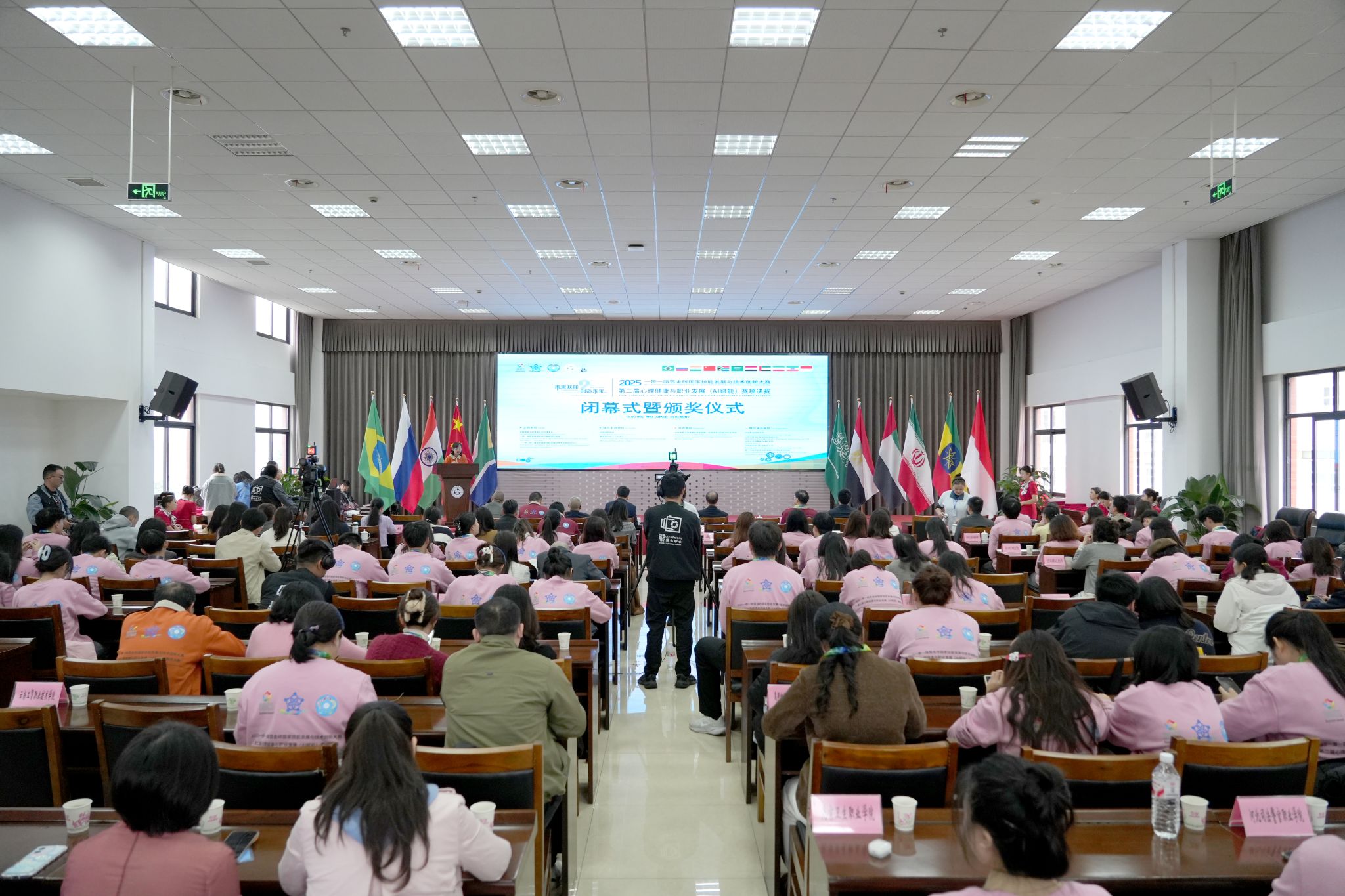 11月9日,2025一带一路暨金砖国家技能发展与技术创新大赛之第二届心理健康与职业发展(AI赋能)赛项决赛在sunbet申搏官方网站圆满落下帷幕。当日上午,闭幕式暨颁奖仪式在学校学术交流中心3004顺利举行。金砖国家技能发展与技术创新大赛组委会执委会国内竞赛办公室五处副处长林秋明,赛项专家组组长、国家卫生健康委能力建设与继教中心学术部原主任刘晨教授,赛项仲裁长、北京大学心理与认知科学学院李同归教授,北京企学研教育科技研究院竞赛合作处副主任刘宇同,山东中科慧心智能科技有限公司副总经理张兆圣,sunbet申搏官方网站校长刘忠,党委委员、副校长张学河,学生工作部部长张勇等校内外领导及嘉宾出席闭幕式。闭幕式由学生工作部副部长叶利丽主持。