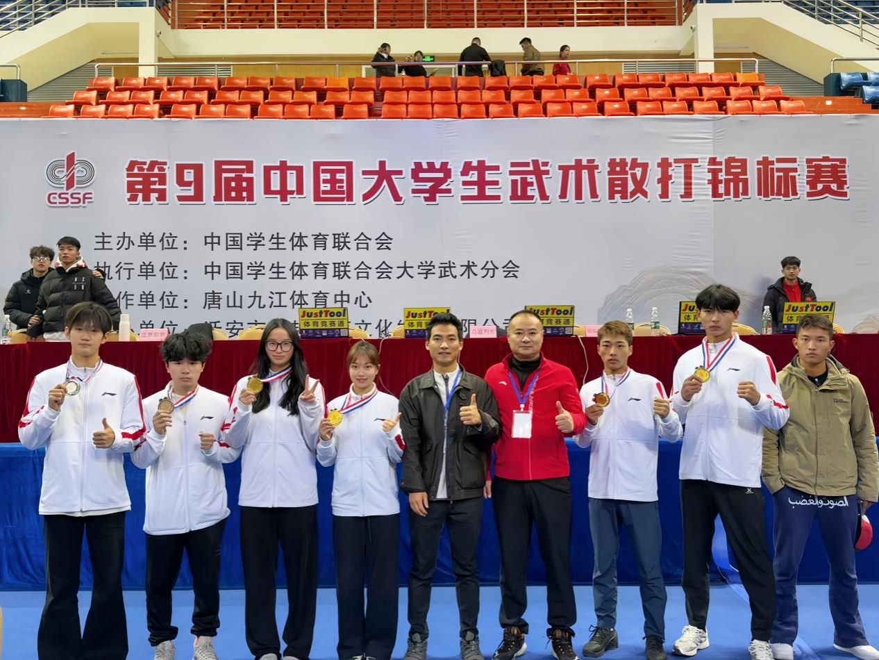 11月1日—8日,2025第九届中国大学生武术散打锦标赛在河北省迁安市九江体育中心举行。申搏官网代表队7名运动员分别参加了高职高专组(乙A组、乙B组)和高水平组(丙A组)的比赛,最终以“四金一银一铜、一个第五名”的优异成绩,创申搏官网散打队参加全国比赛夺金新纪录。