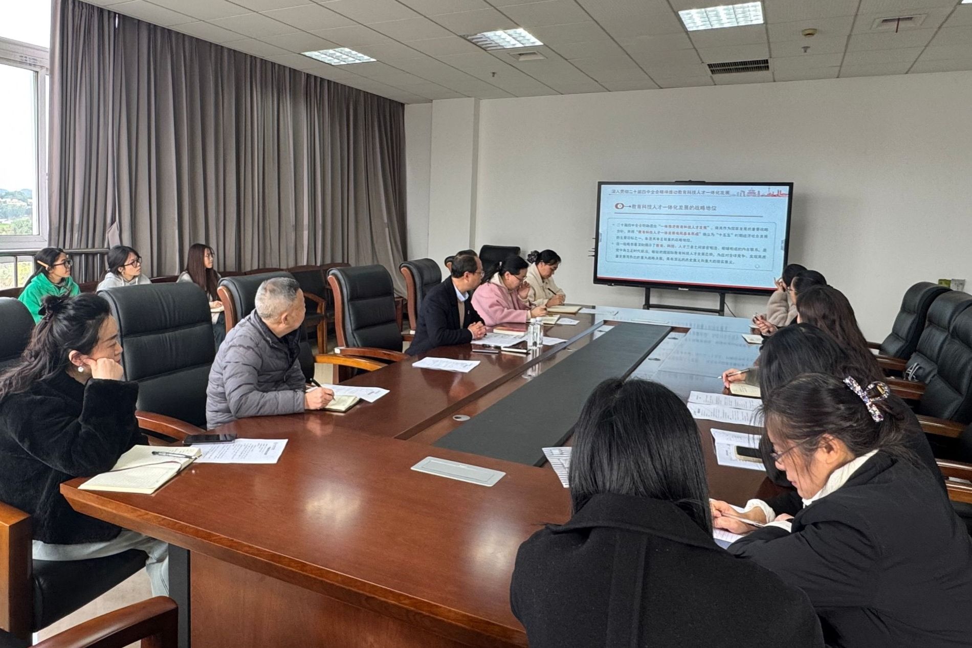 宣讲中,张佳紧扣“一体推进教育科技人才发展”主线,系统解读党的二十届四中全会对教育科技人才的顶层设计与“十五五”规划锚定高质量发展的核心要求。“教育科技人才是全面建设社会主义现代化国家的基础性、战略性支撑。”他强调,这一论断既标定了新时代教育事业的历史坐标,更为职业院校服务国家战略指明了方向。结合“十五五”规划“高质量发展”主题,他指出,高职院校作为技术技能人才培养的主阵地,必须主动融入国家大局,以“服务国家战略需求、对接产业升级需要”为核心定位,在教育链、科技链、人才链深度融合中找准发力点,切实扛起为党育人、为国育才的使命担当。