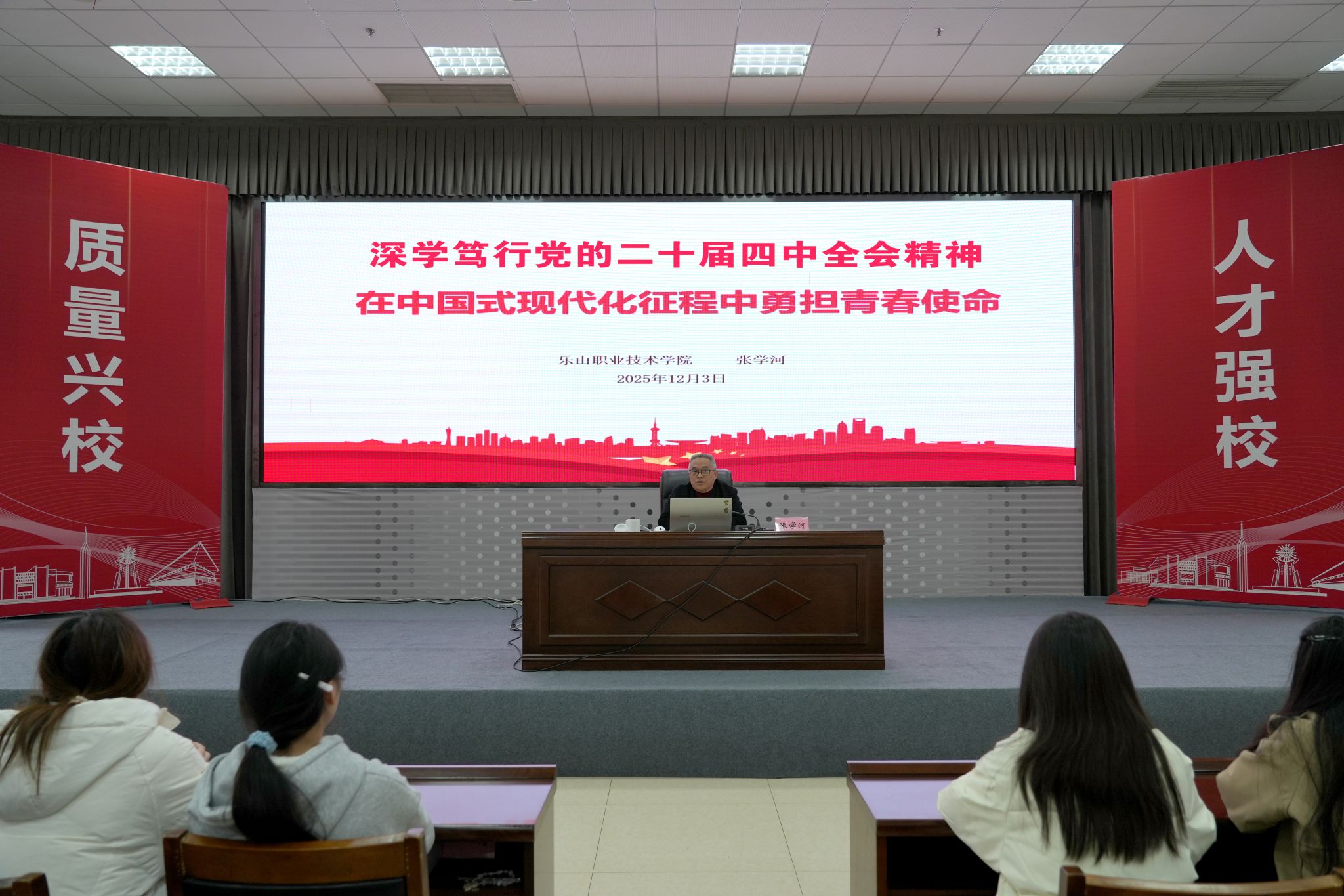 仪式结束后,张学河以“深学笃行党的二十届四中全会精神 在中国式现代化征程中勇担青春使命”为主题,聚焦党的二十届四中全会精神解读,结合国家“十五五”规划展望,并紧密联系职业教育发展实际与学校学生的具体典型案例,进行了深入浅出的讲解,为全体学员上了内涵丰富、指导性强的第一课。