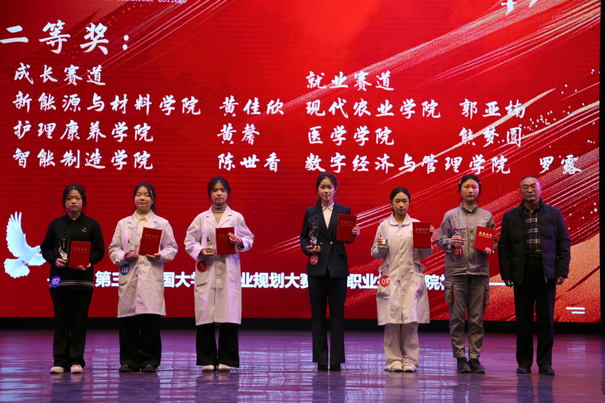 经过多轮激烈角逐与评委团严谨评审,最终确定各赛道获奖名单:成长赛道黄思逸、邓希贤同学,就业赛道陈旭阳、付惠岚凭借清晰的规划逻辑、出色的表达能力斩获一等奖;成长赛道黄佳欣、黄馨、陈世香,就业赛道郭亚楠、熊梦圆、罗露同学荣获二等奖;成长赛道叶涌旗、何丽、赵伟、陈言钦、代佳怡,就业赛道陈嘉馨、杨钦艳、蒋彤、卿秋玥、王锦涛同学摘得三等奖。
