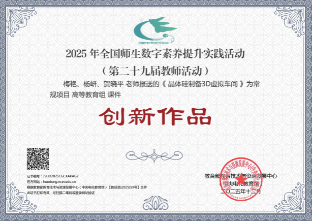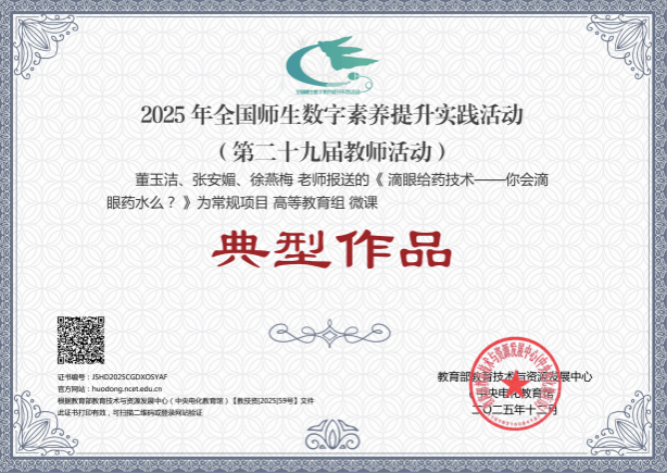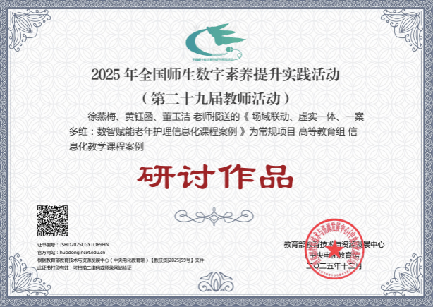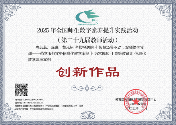 近日,由教育部教育技术与资源发展中心(中央电化教育馆)主办的2025年全国师生数字素养提升实践活动(第二十九届教师活动)落下帷幕。在常规项目参与名单中,申搏官网梅艳团队课件作品《晶体硅制备3D虚拟车间》和岑菲菲团队信息化教学课程案例作品《智慧场景驱动,双师协同实训——药学服务实务信息化教学案例》获评“创新作品”;董玉洁团队微课作品《滴眼给药技术——你会滴眼药水么?》获评“典型作品”;徐燕梅团队信息化教学课程案例作品《场域联动、虚实一体、一案多维:数智赋能老年护理信息化课程案例》获评“研讨作品”。