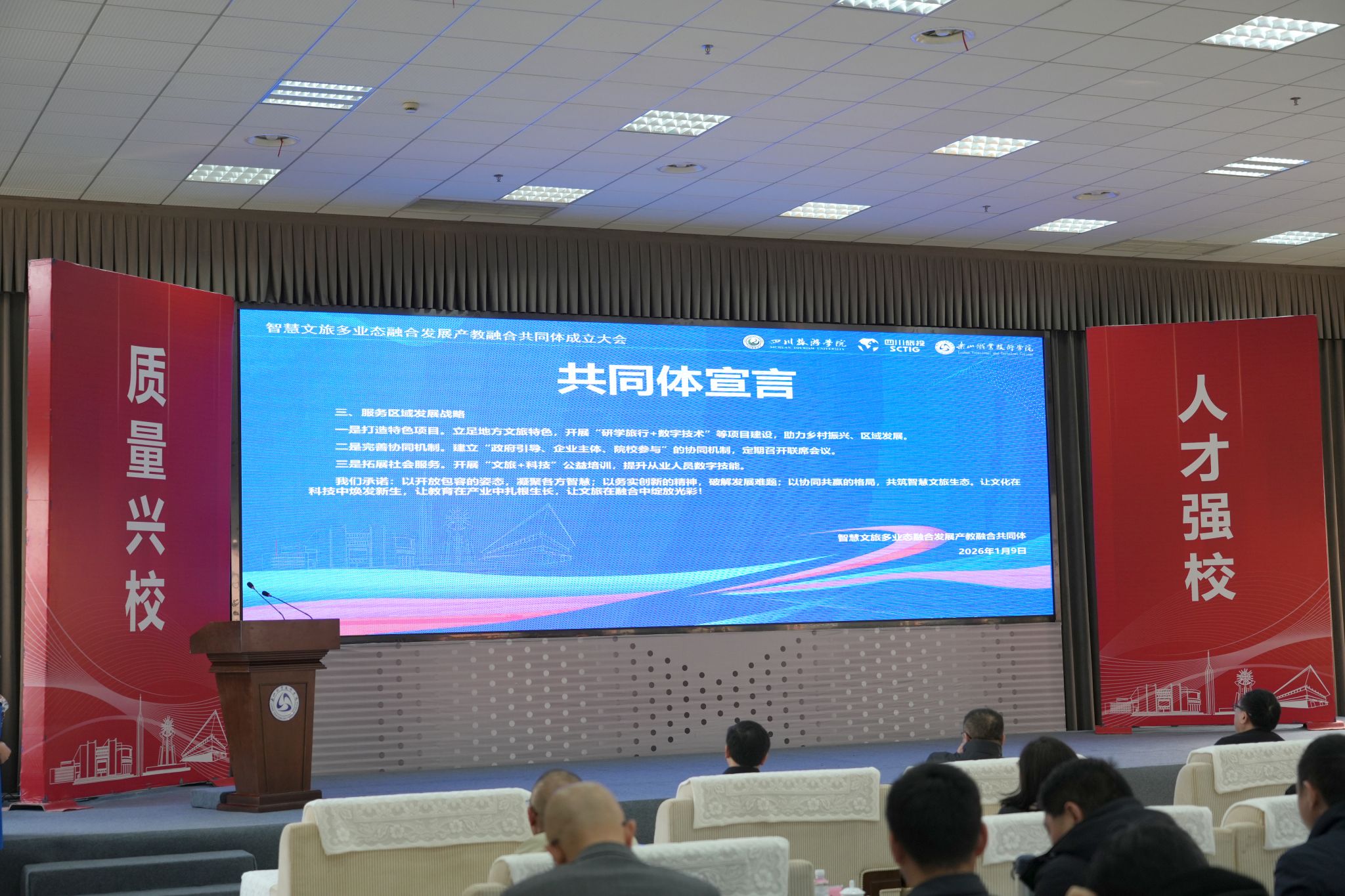 1月9日,智慧文旅多业态融合发展产教融合共同体成立大会在sunbet申搏官方网站隆重举行,共同体由四川旅游学院、四川省旅游投资集团有限责任公司、sunbet申搏官方网站联合发起,以“智融文旅・产教协同 共筑多业态融合发展新生态”为主题,旨在推动文旅多业态深度融合,整合行业优质资源,构建文旅产教融合新生态。来自省内外80余家院校和企业150余名代表参会。