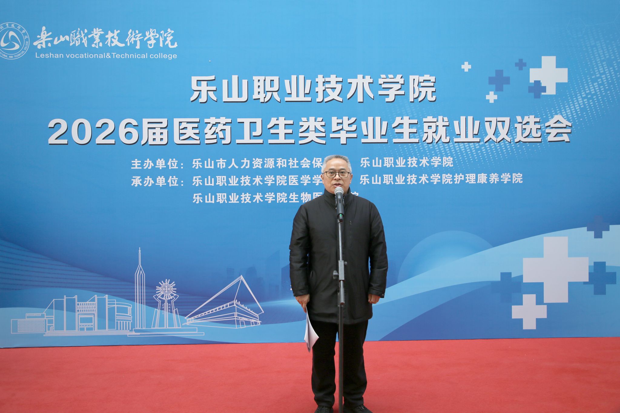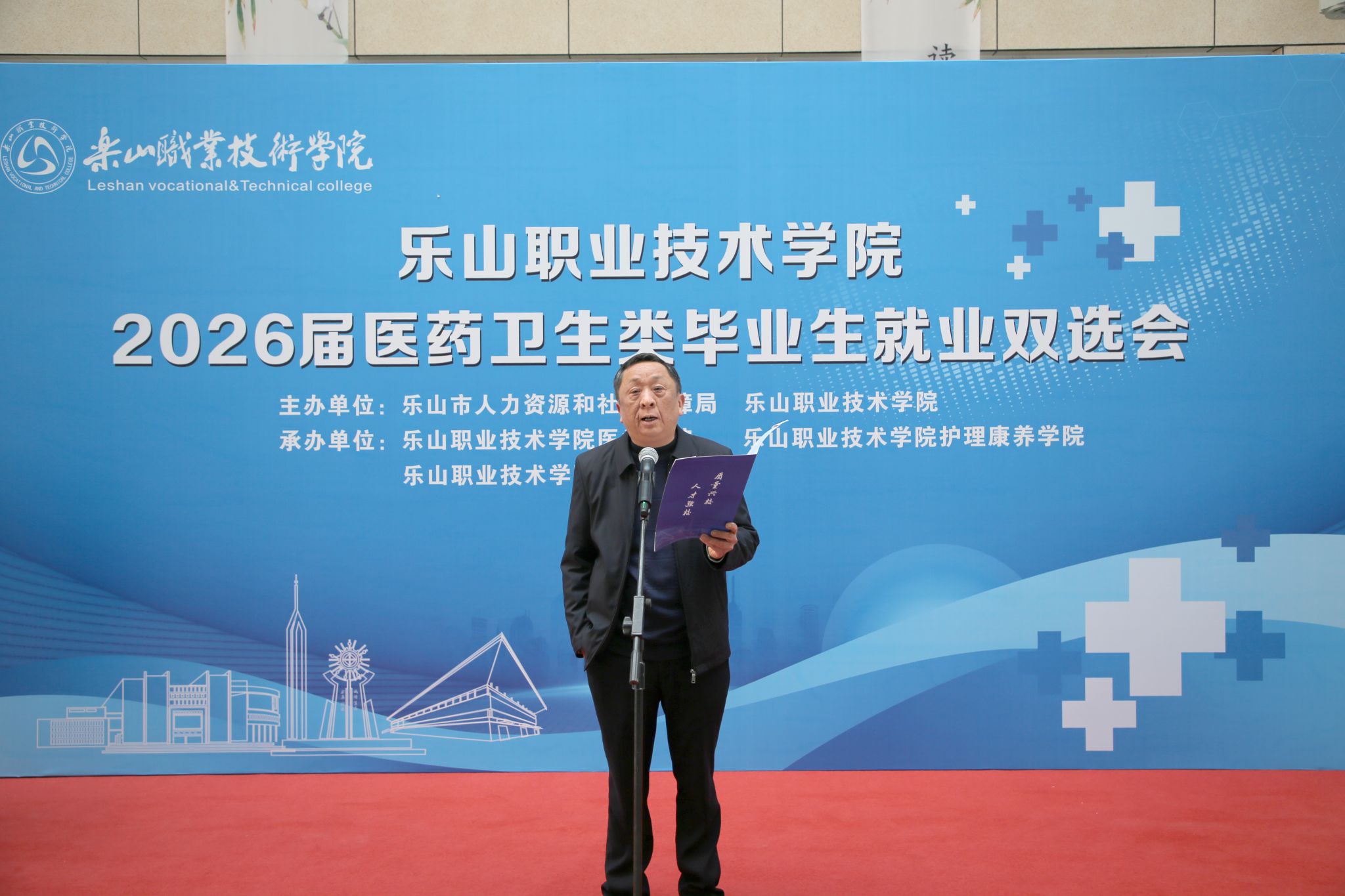 春启新程聚英才,校企携手促就业。1月9日,sunbet申搏官方网站2026届医药卫生类毕业生就业双选会顺利举行。乐山市人力资源和社会保障局二级巡视员黄卫东出席活动并致辞,参会企业代表、学院师生代表共同参与。