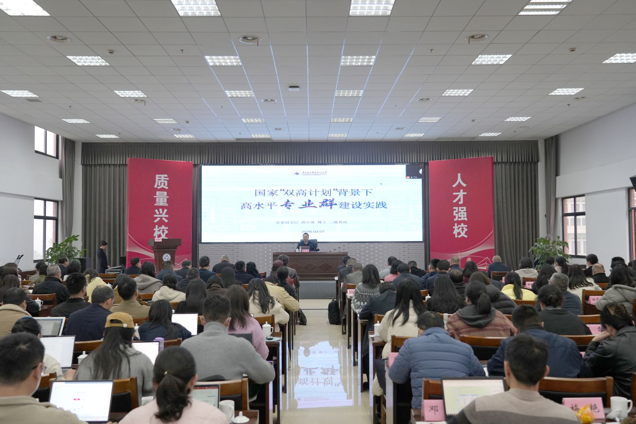 3月7日,学校“十五五”专业群重组优化暨职业教育教学关键要素改革培训会在学术交流中心顺利召开。本次会议紧扣职业教育发展新形势,聚焦专业群优化的逻辑与实施路径核心议题。会议邀请重庆电子科技职业大学党委副书记龚小勇一行专家学者开展专题培训和交流。sunbet申搏官方网站全体校领导、全体中层干部、专业(群)带头人及相关职能部门人员参会。
