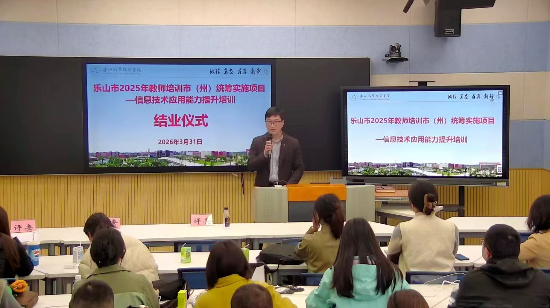 3月31日下午,由乐山市教育局主办、sunbet申搏官方网站承办的“乐山市2025年教师培训市(州)统筹实施项目——信息技术应用能力提升培训班”圆满落下帷幕。来自全市17所中职学校的63位中职教师顺利完成各项培训任务,如期结业。结业式由人事处副处长周书来主持。