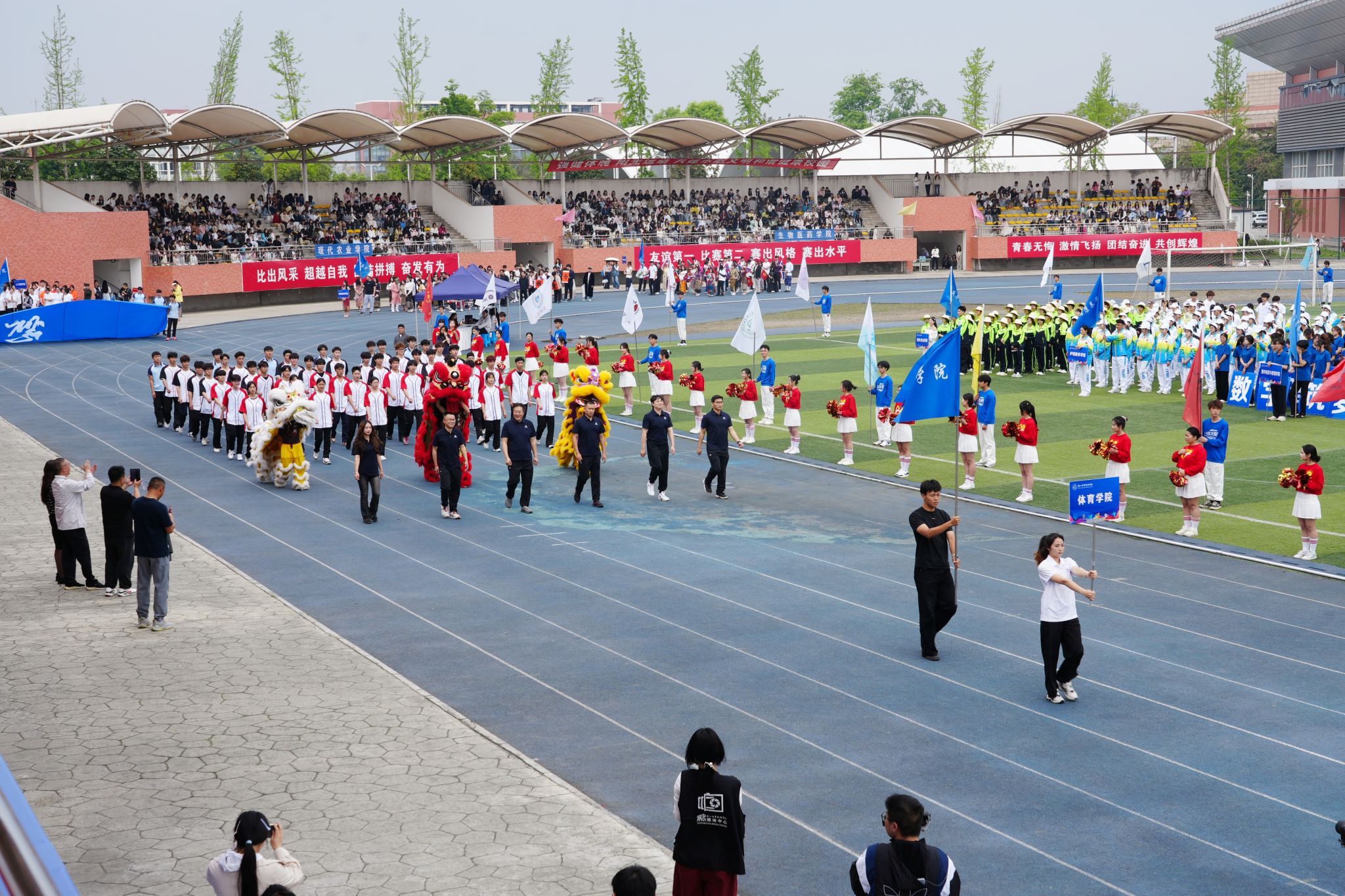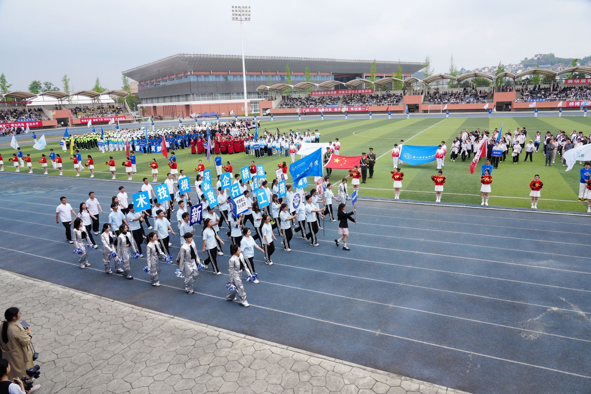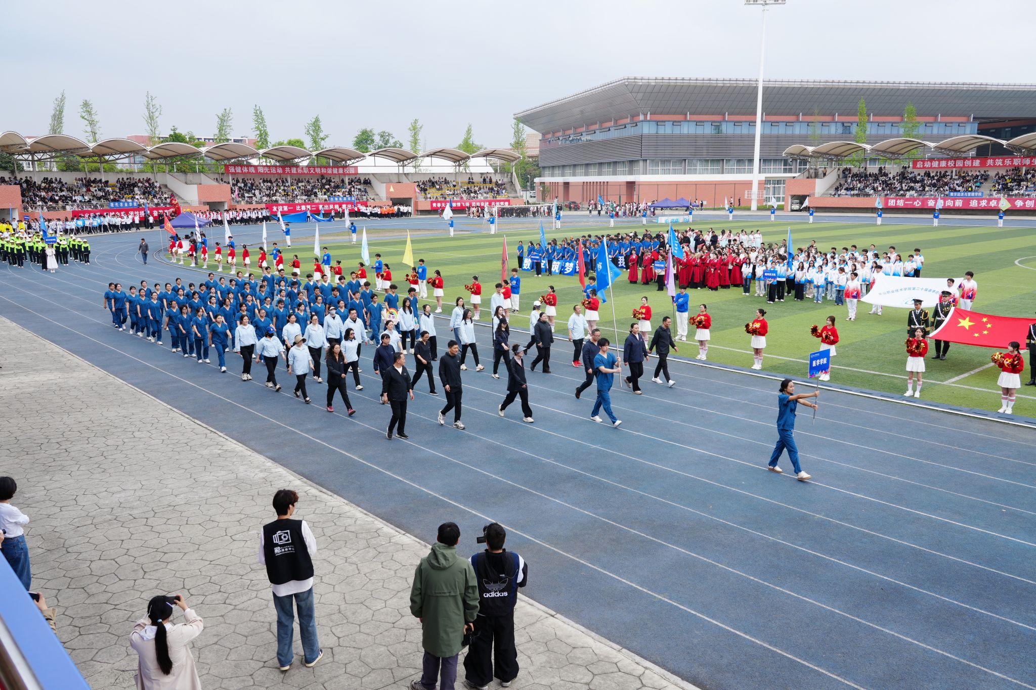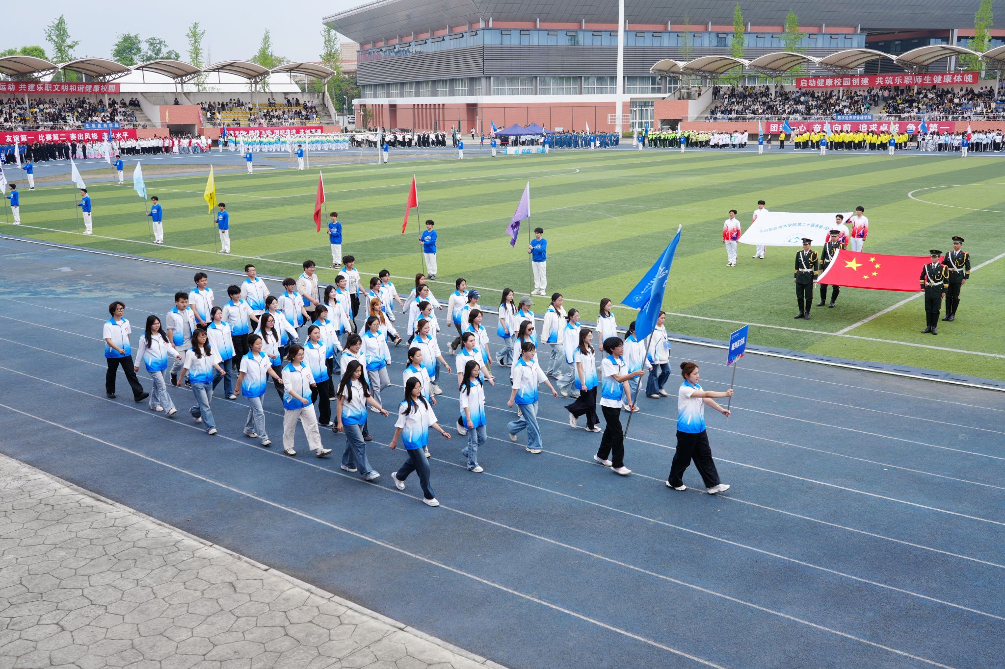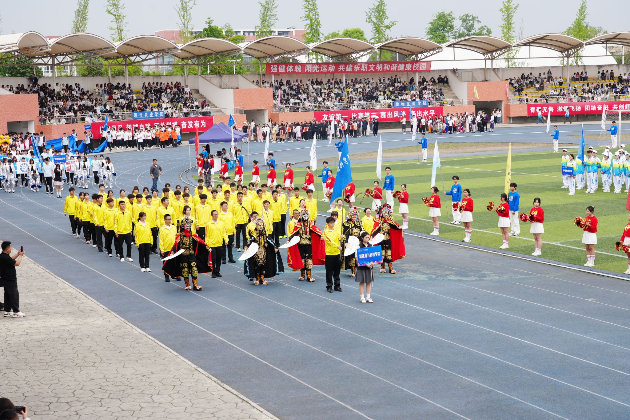 在激昂的《运动员进行曲》中,各方阵精神饱满、依次亮相:裁判员方队公正严谨、护航赛事;机关代表队服务师生、昂扬进取。马克思主义学院师生同心、铸魂育人;文化旅游学院彰显文旅担当,助力地方发展;数字经济与管理学院笃行实干、奋勇争先;生物医药学院中西相融、朝气蓬勃;护理康养学院七十余载薪火相传,医者仁心与非遗传承并举;医学学院白衣执甲、守护安康;现代农业学院扎根乡土、强农兴农;新能源与材料学院传承创新、科技向绿;智能制造学院精工致新、屡创佳绩;体育学院意气风发、勇攀高峰;人工智能学院以智逐梦、活力四射;素质教育学院中外携手、以文化人;国际学生代表队多元交融、尽展开放办学风采。 入场完毕,全场肃立,升国旗、奏唱国歌,庄严神圣。