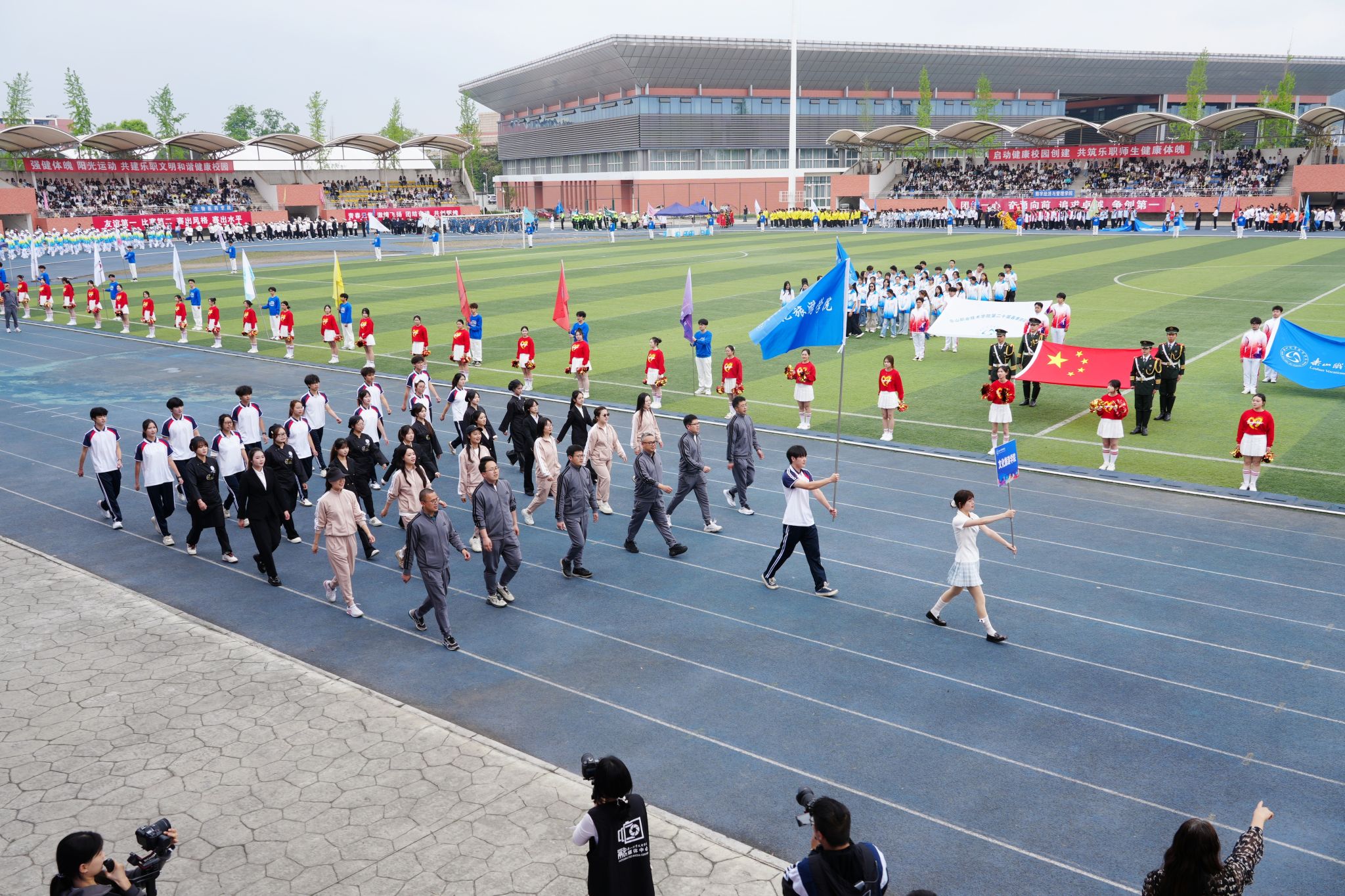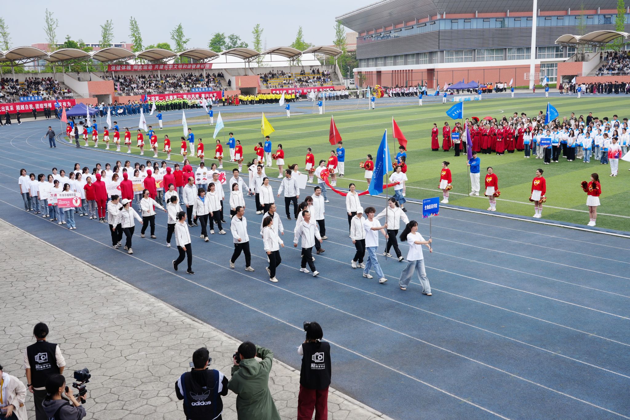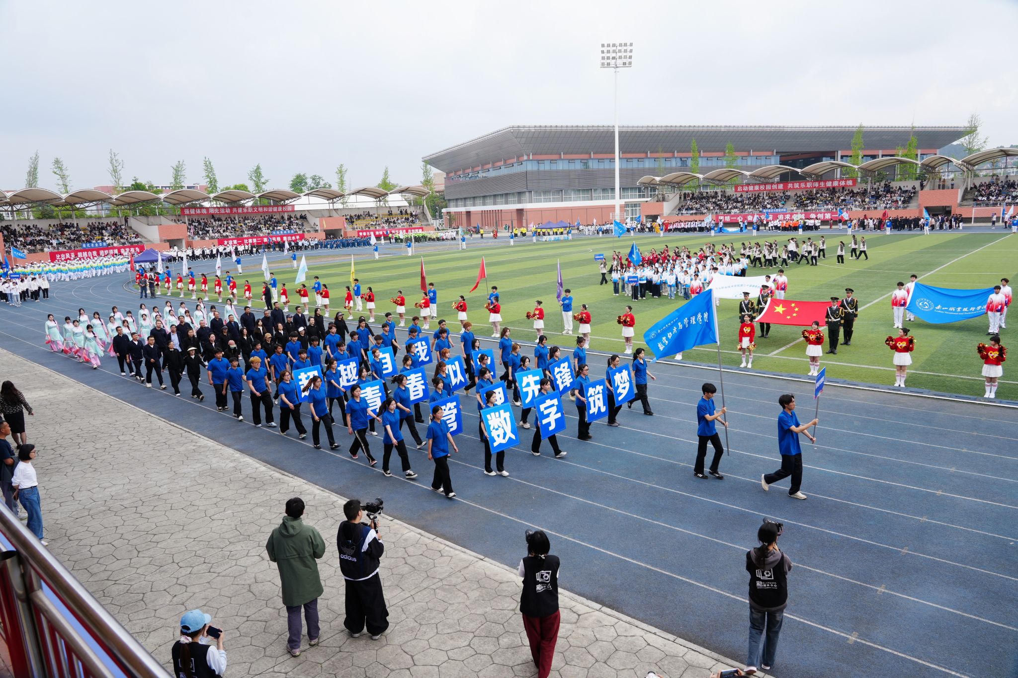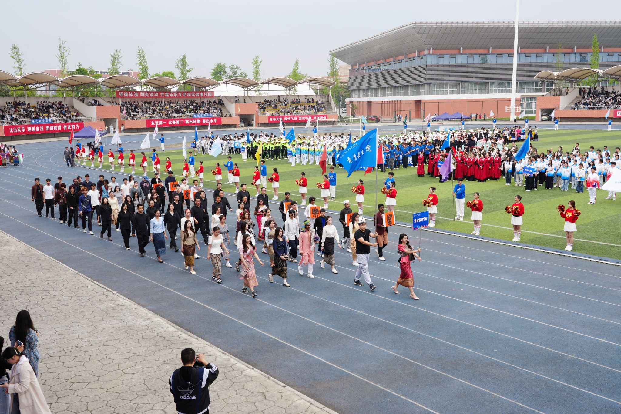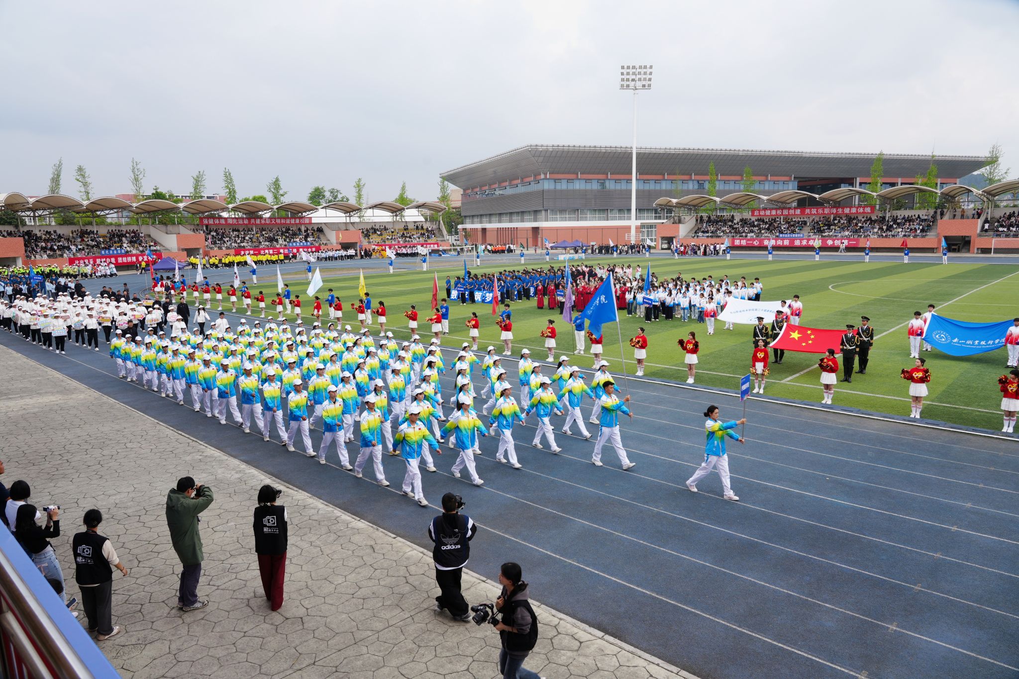 在激昂的《运动员进行曲》中,各方阵精神饱满、依次亮相:裁判员方队公正严谨、护航赛事;机关代表队服务师生、昂扬进取。马克思主义学院师生同心、铸魂育人;文化旅游学院彰显文旅担当,助力地方发展;数字经济与管理学院笃行实干、奋勇争先;生物医药学院中西相融、朝气蓬勃;护理康养学院七十余载薪火相传,医者仁心与非遗传承并举;医学学院白衣执甲、守护安康;现代农业学院扎根乡土、强农兴农;新能源与材料学院传承创新、科技向绿;智能制造学院精工致新、屡创佳绩;体育学院意气风发、勇攀高峰;人工智能学院以智逐梦、活力四射;素质教育学院中外携手、以文化人;国际学生代表队多元交融、尽展开放办学风采。 入场完毕,全场肃立,升国旗、奏唱国歌,庄严神圣。