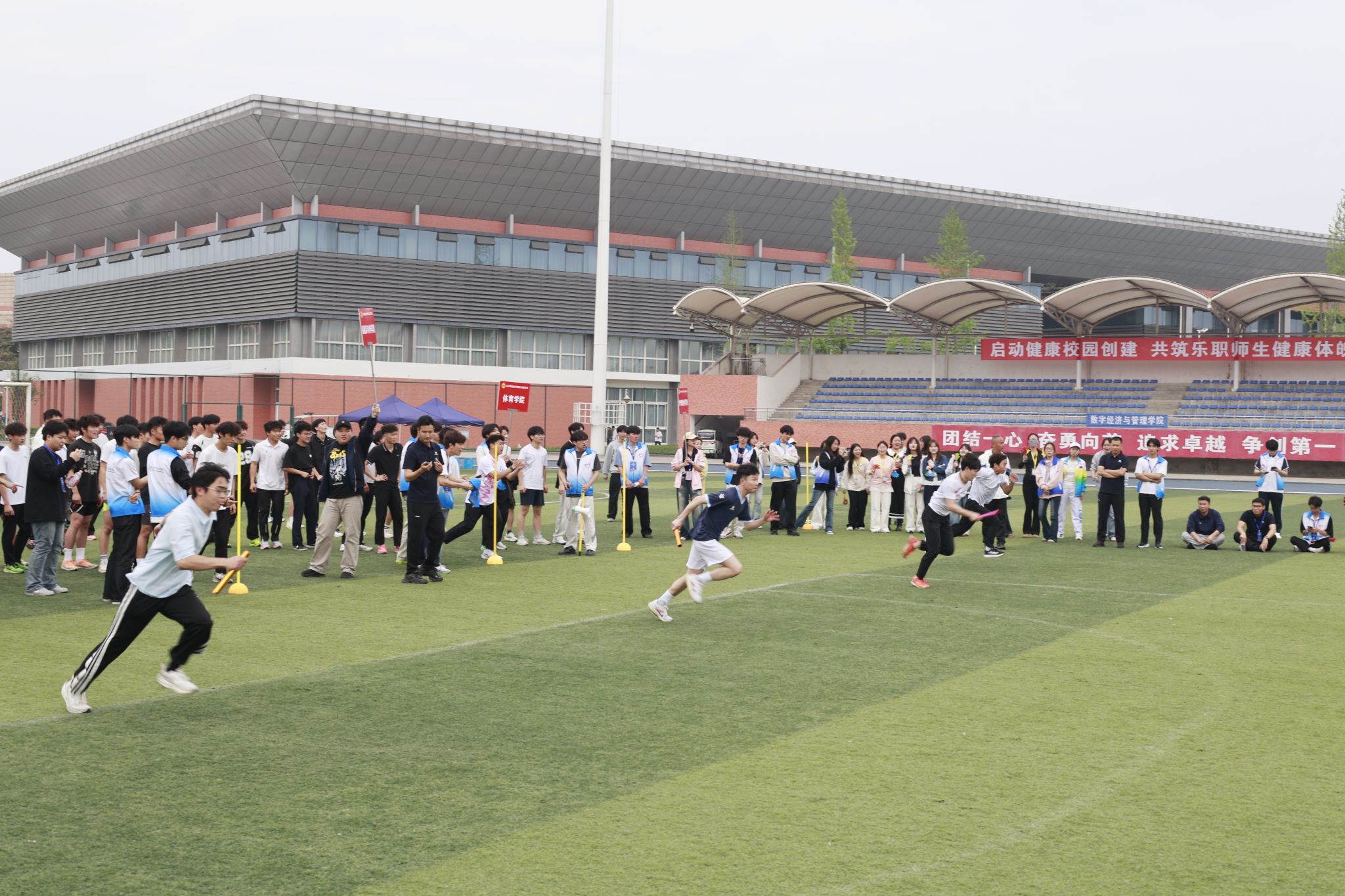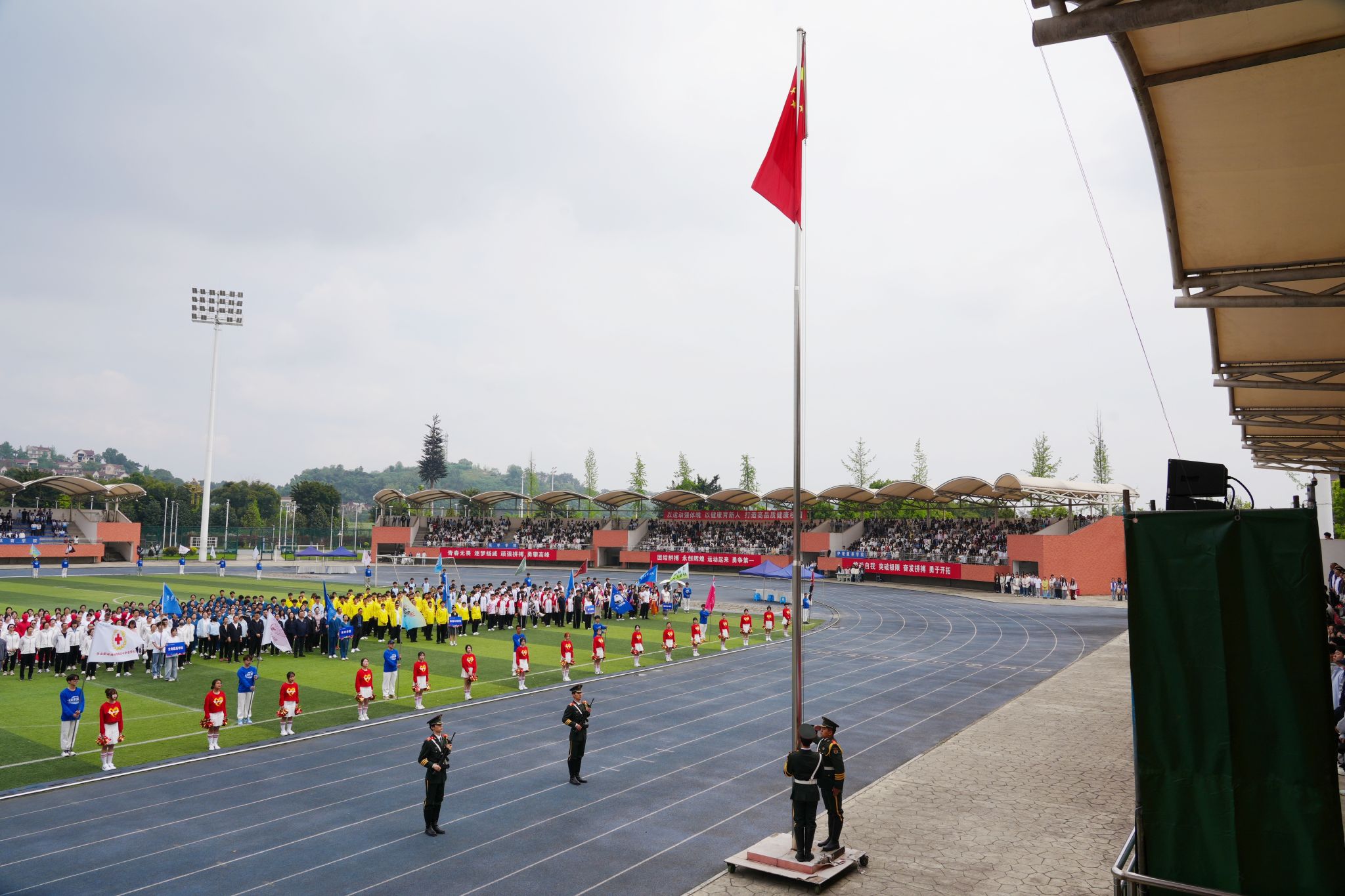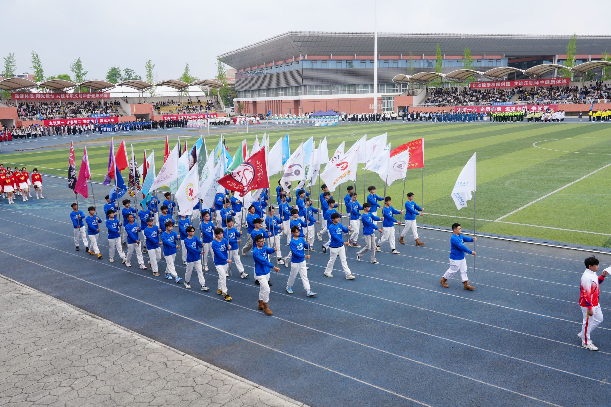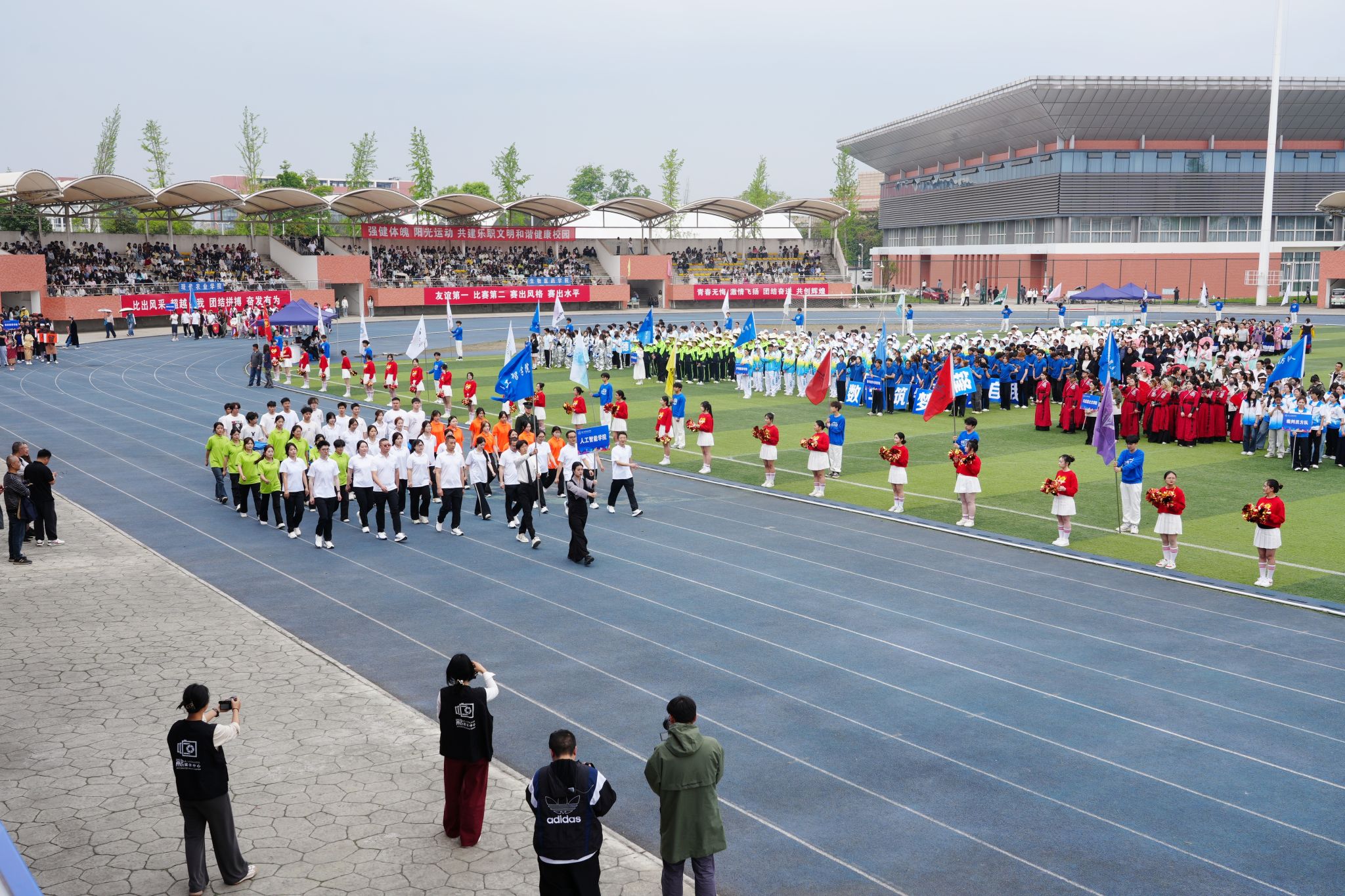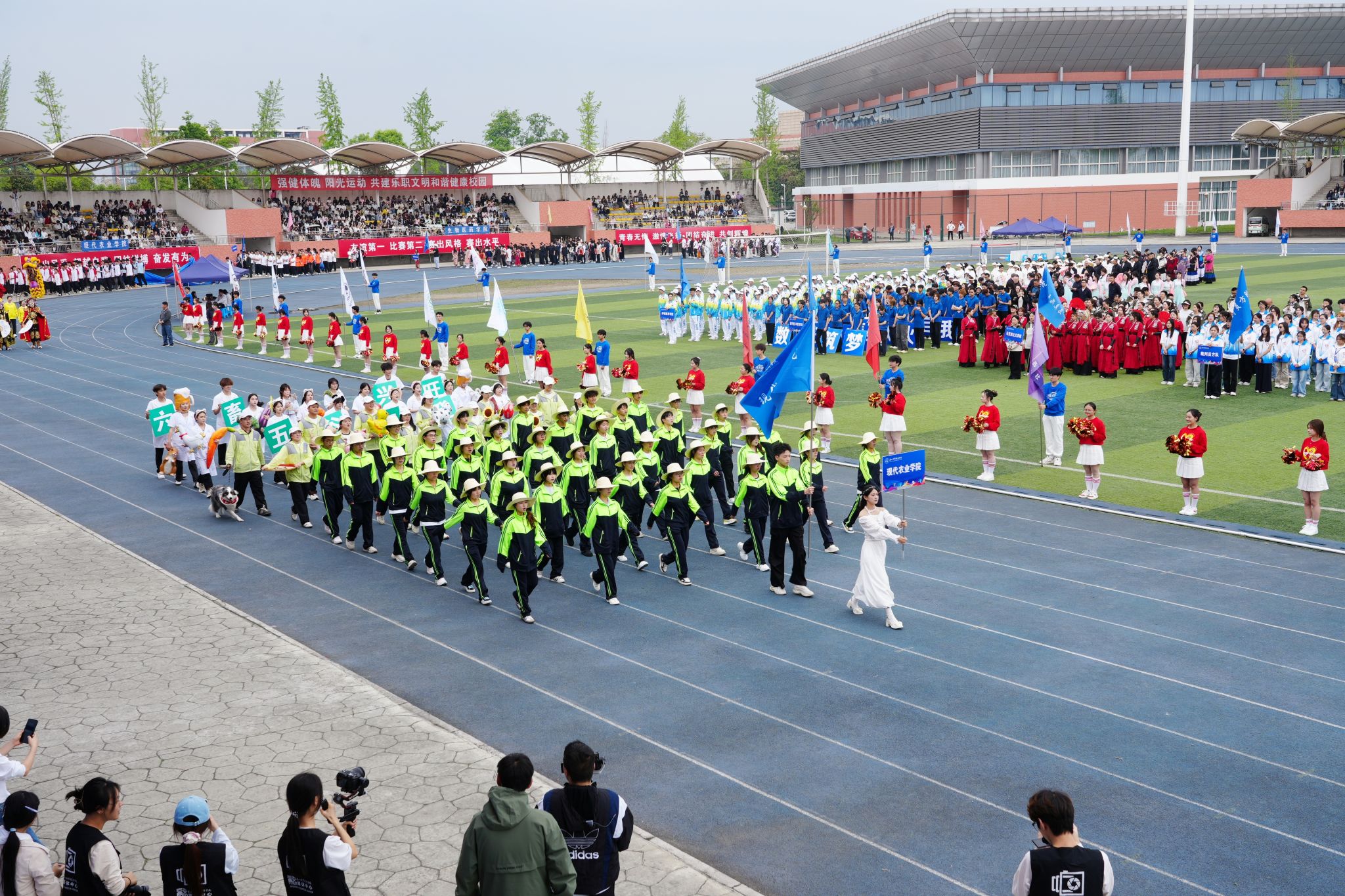 在激昂的《运动员进行曲》中,各方阵精神饱满、依次亮相:裁判员方队公正严谨、护航赛事;机关代表队服务师生、昂扬进取。马克思主义学院师生同心、铸魂育人;文化旅游学院彰显文旅担当,助力地方发展;数字经济与管理学院笃行实干、奋勇争先;生物医药学院中西相融、朝气蓬勃;护理康养学院七十余载薪火相传,医者仁心与非遗传承并举;医学学院白衣执甲、守护安康;现代农业学院扎根乡土、强农兴农;新能源与材料学院传承创新、科技向绿;智能制造学院精工致新、屡创佳绩;体育学院意气风发、勇攀高峰;人工智能学院以智逐梦、活力四射;素质教育学院中外携手、以文化人;国际学生代表队多元交融、尽展开放办学风采。 入场完毕,全场肃立,升国旗、奏唱国歌,庄严神圣。