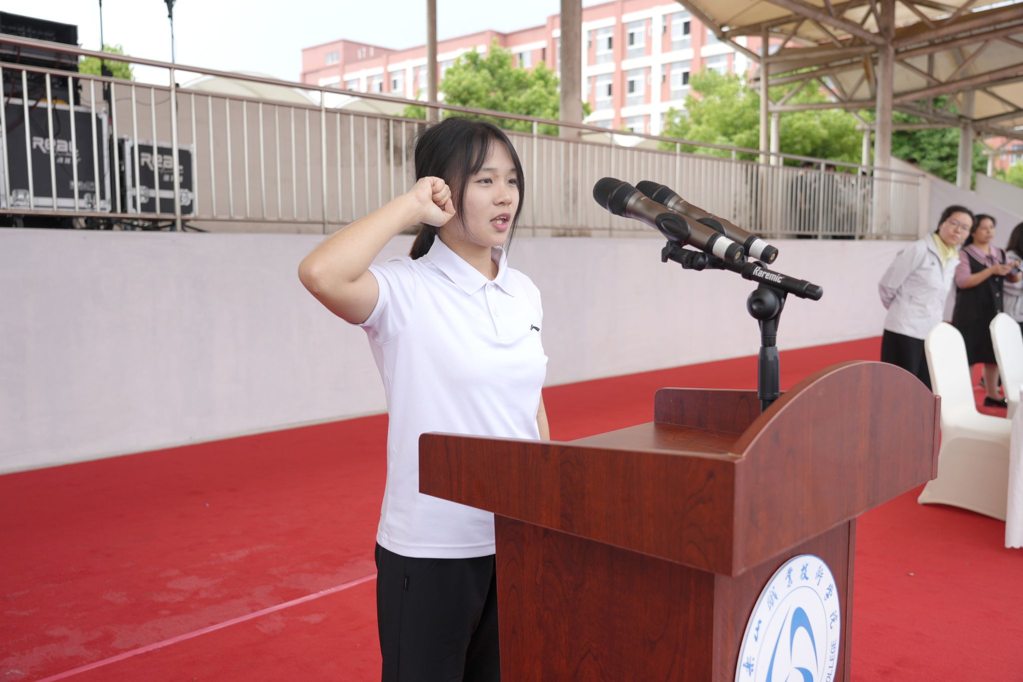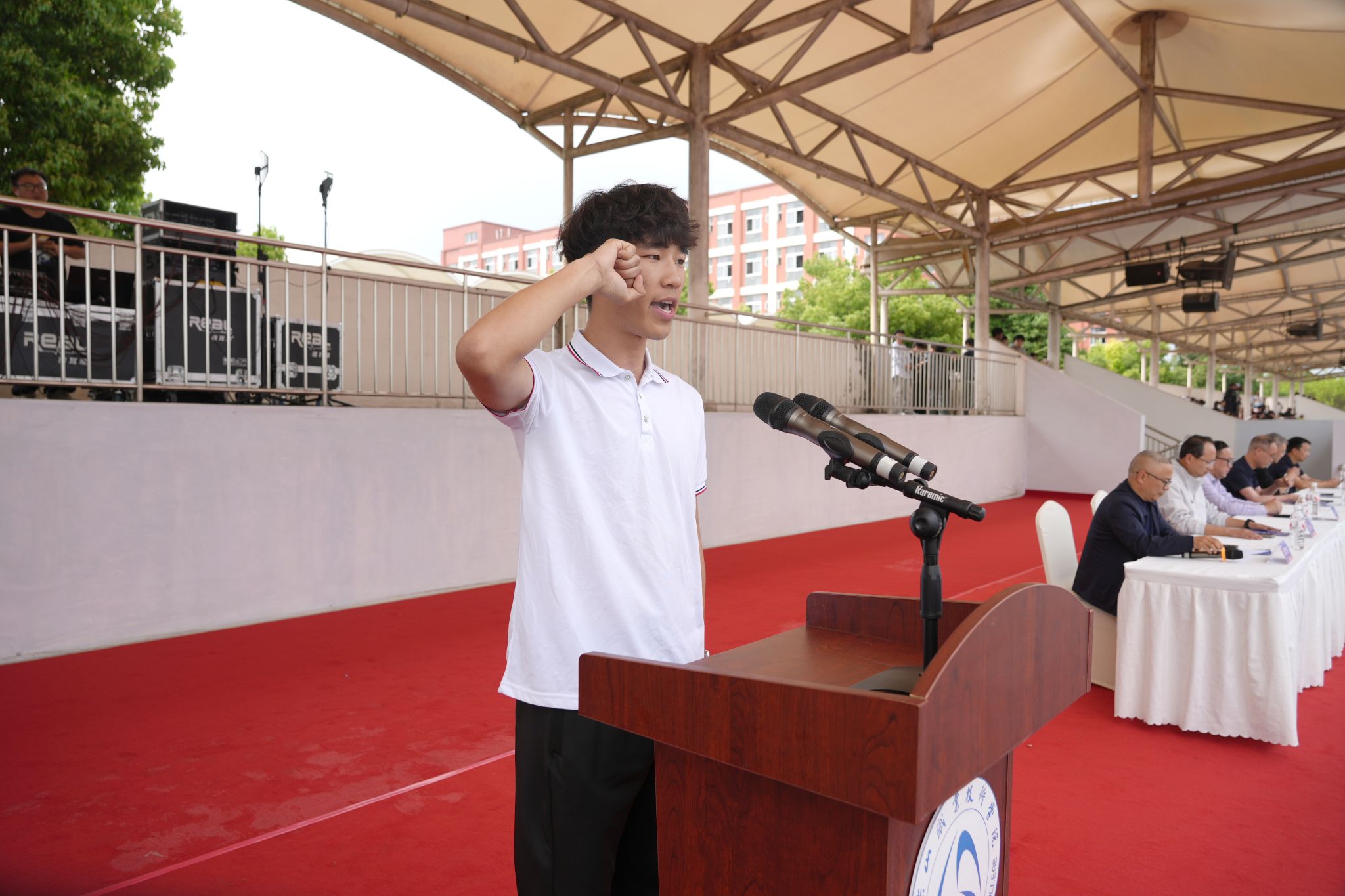 随后,裁判员代表、教职工代表、学生运动员代表依次上台宣誓。将严格遵守竞赛规程,恪守体育道德,坚持公平公正、顽强拼搏、文明参赛,共同维护赛场秩序,确保运动会安全、有序、圆满进行。