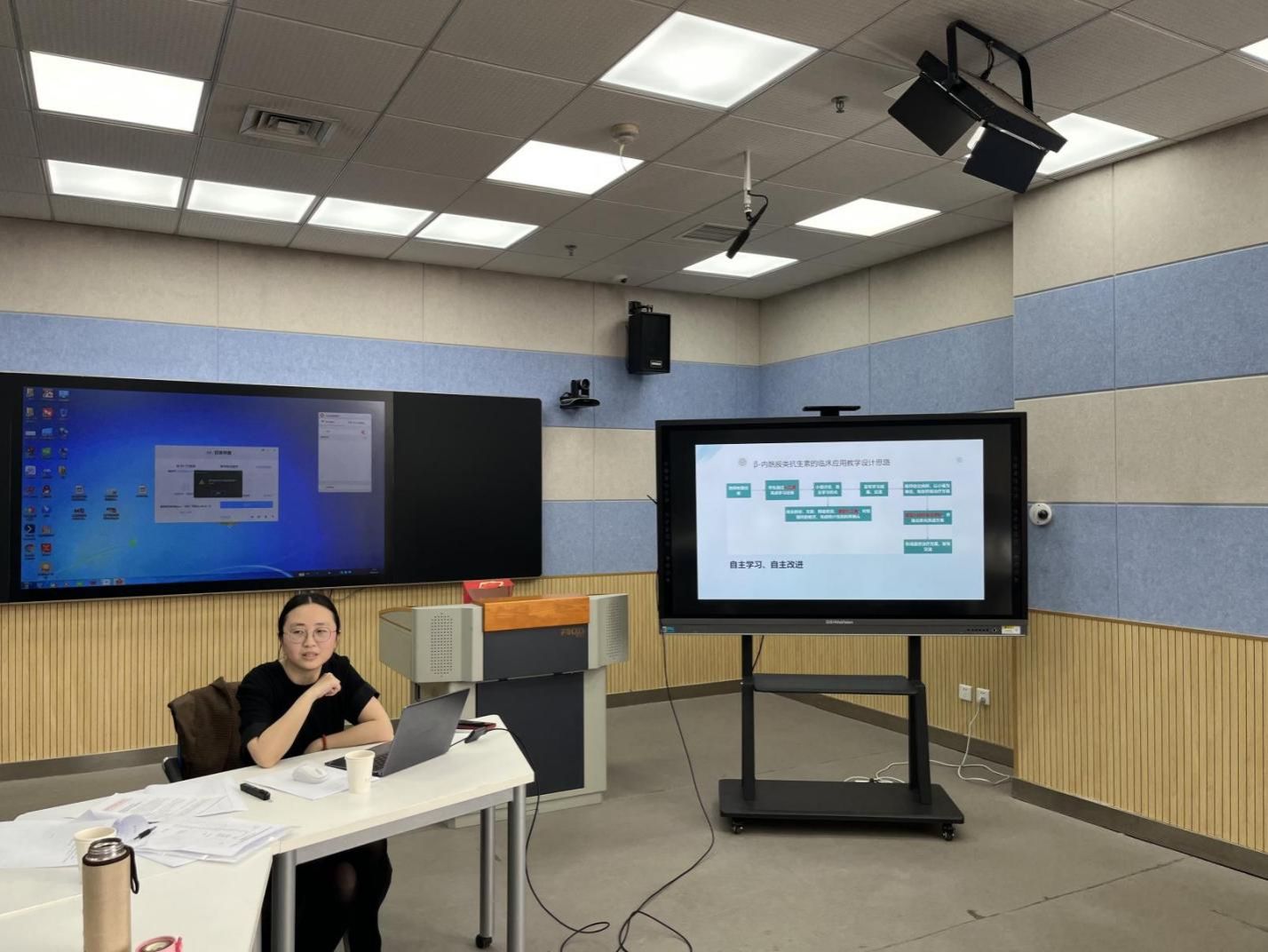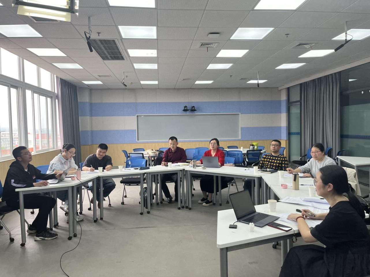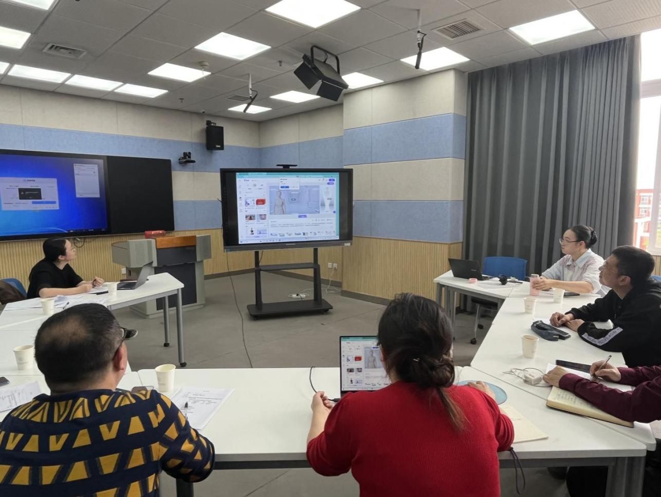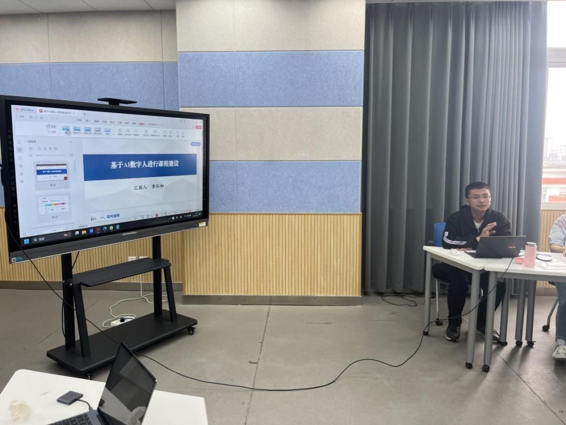 4月11日线下集中研讨会,4名团队教师结合培训成果进行主题分享。徐娇以“AI在教学改革项目策划与课堂教学设计中的应用”为题,展示如何利用AI工具辅助开展科研选题、课题申报和教学设计。朱链链分享了利用剪映制作微课视频的过程和效果。袁明焱聚焦“AI在课堂教学中的应用”,展示了AI在案例生成、作业批改、学情分析等方面的具体应用实例。李弘知重点演示了如何运用腾讯智影构建自身AI数字人。团队成员围绕AI技术在教育教学中应用所遇到的困难、教师如何应对AI时代的冲击、数据隐私保护等问题展开讨论。
