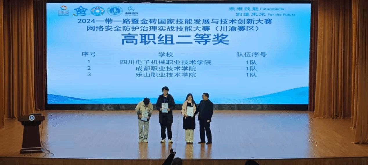 近日,在川渝赛区2024“一带一路”暨金砖国家技能大赛网络安全防护治理赛项选拔赛中,申搏官网学子陈奇宇、叶科、朱佳明组成的团队凭借扎实的网络安全知识、精湛的技术以及出色的团队协作,在指导老师于寒冰的带领下,荣获二等奖。