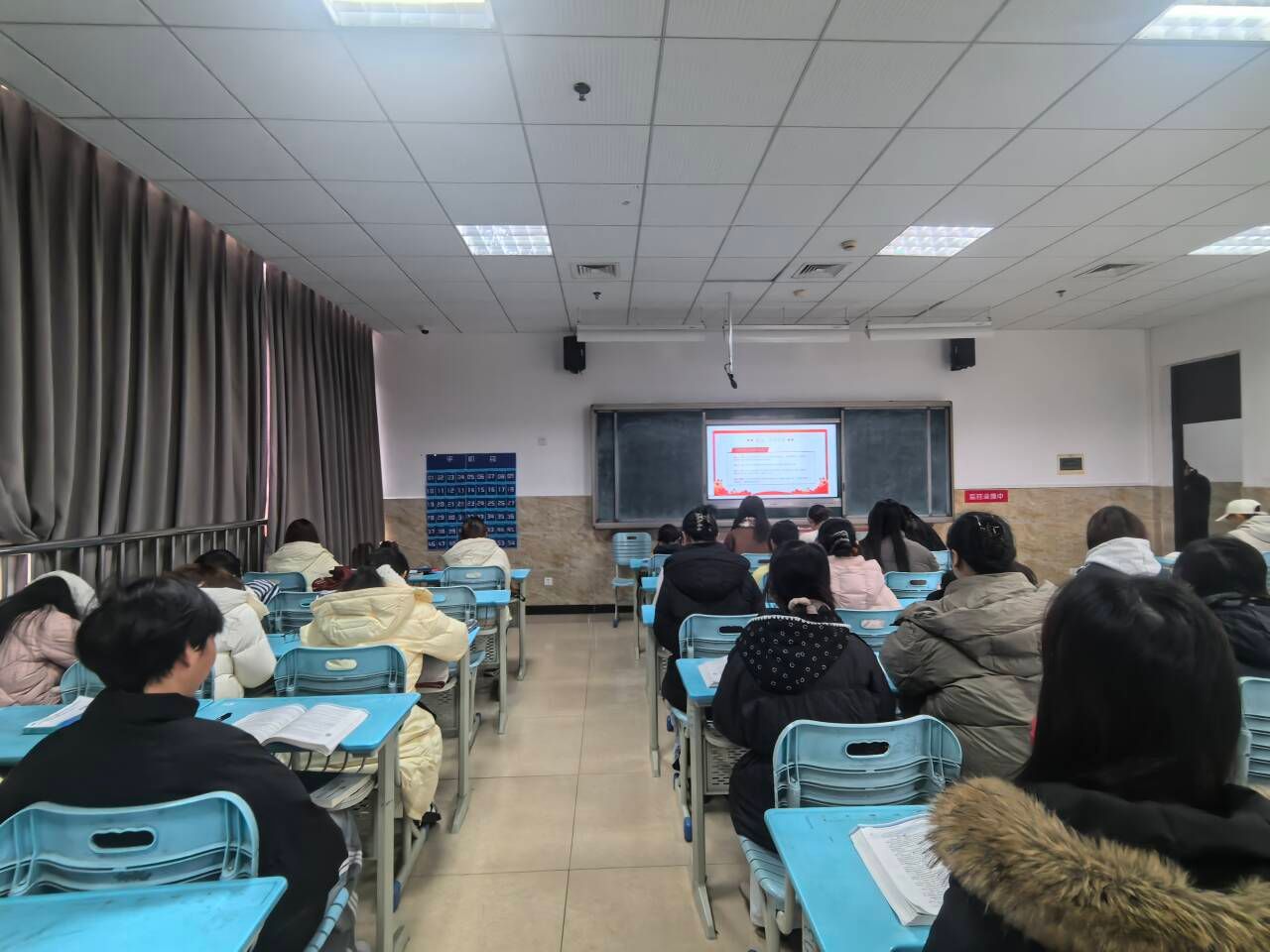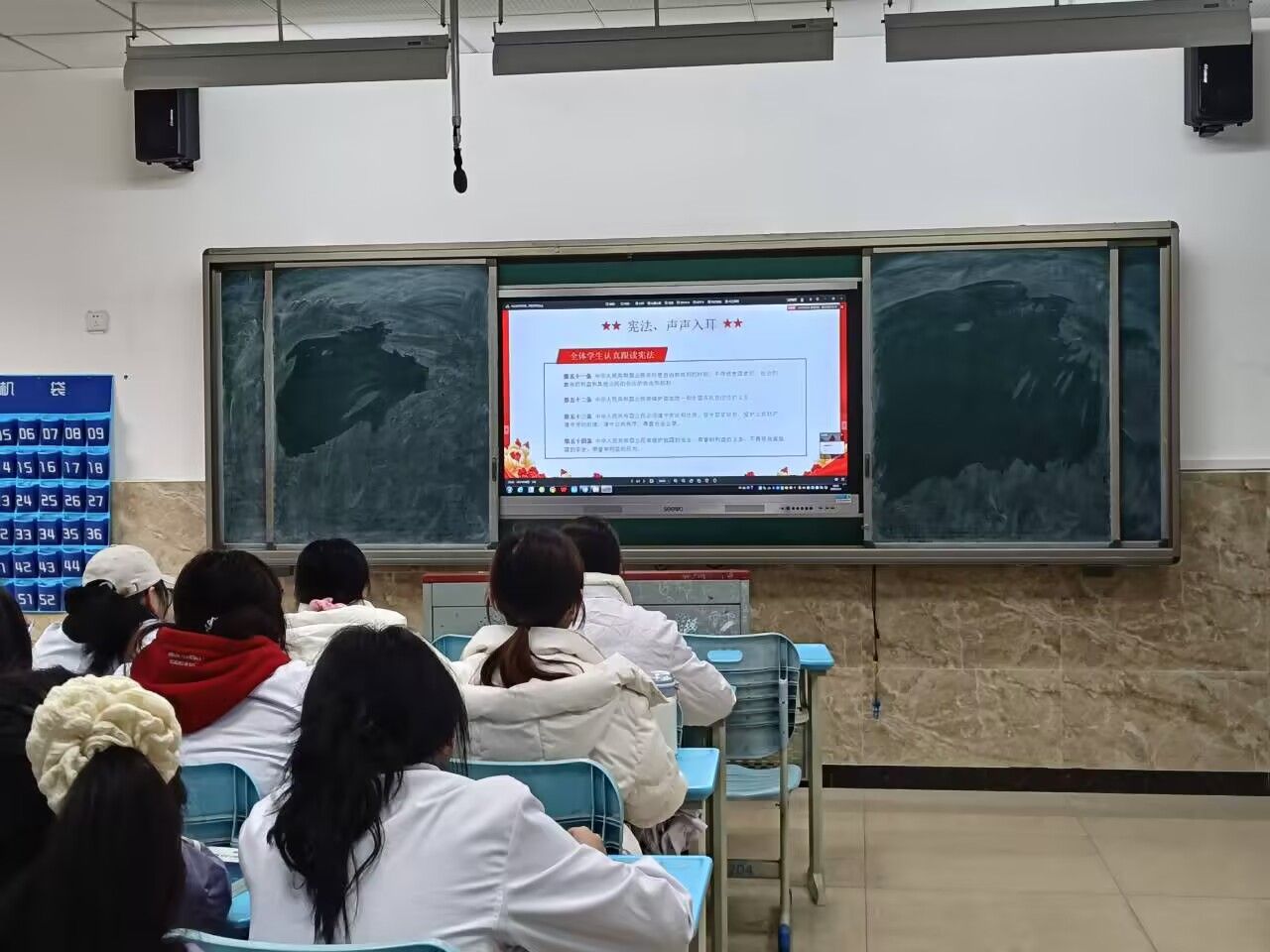 活动当天,晨读直播准时开播。在教育部统一组织的领读声中,同学们精神饱满、坐姿端正,跟随直播同步诵读宪法条文。从宪法总纲到公民的基本权利与义务,字字铿锵有力,句句掷地有声,校园内洋溢着浓厚的法治学习氛围。集中观看的班级里,师生共同跟读,不时交流感悟;分散参与的学生则自觉遵守学习纪律,认真聆听讲解、诵读原文,通过线上互动留言分享学习心得。