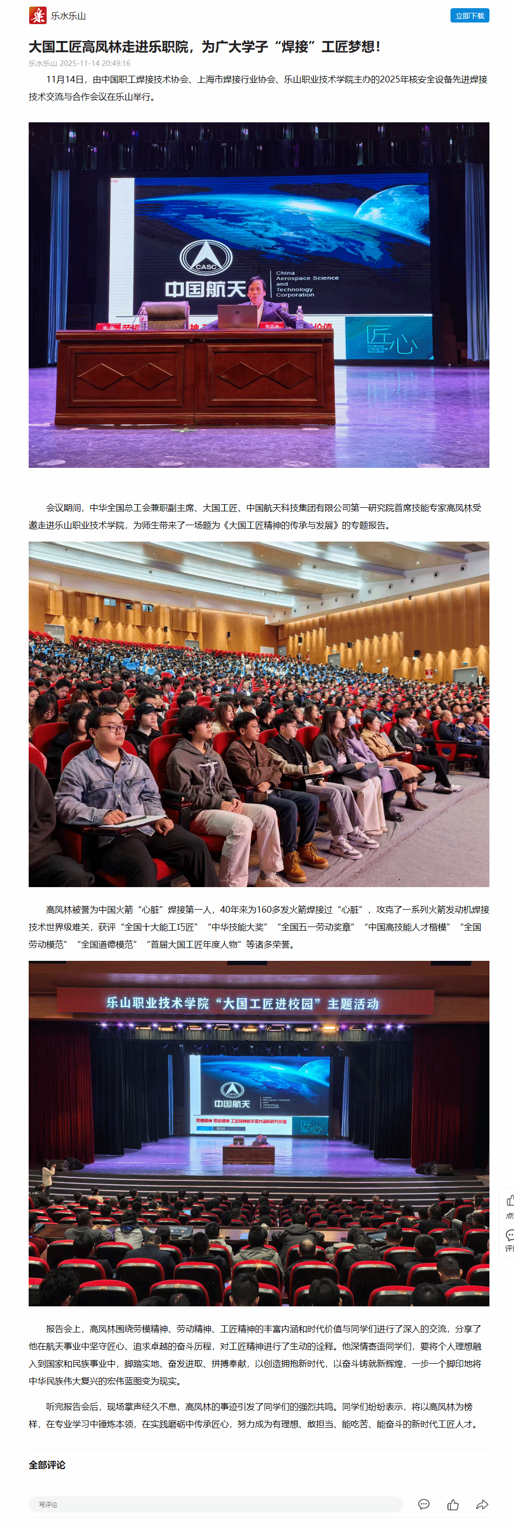 乐水乐山:大国工匠高凤林走进乐职院,为广大学子“焊接”工匠梦想!