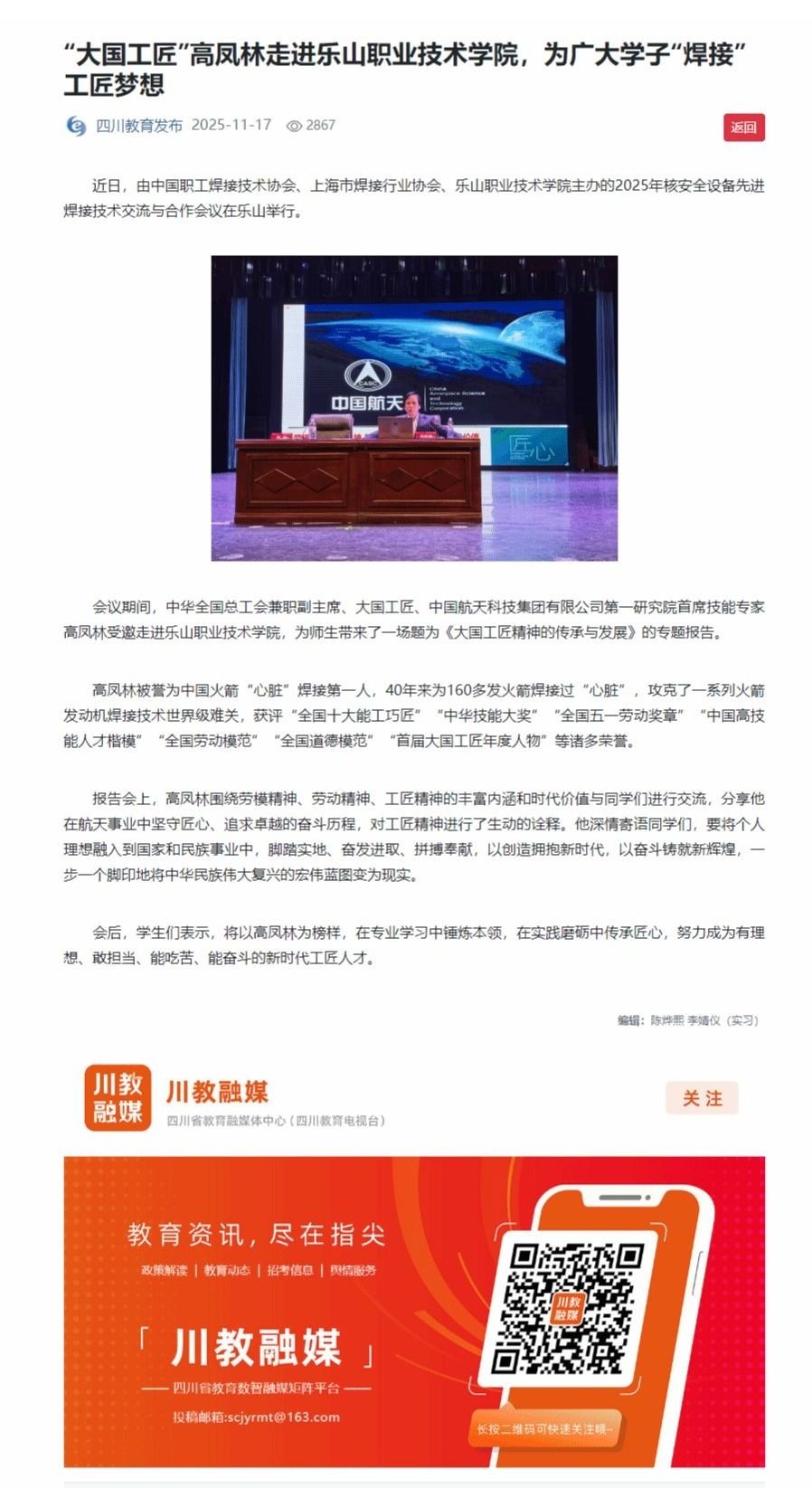 四川职教发布:“大国工匠”高凤林走进乐职院,为广大学子“焊接”工匠梦想