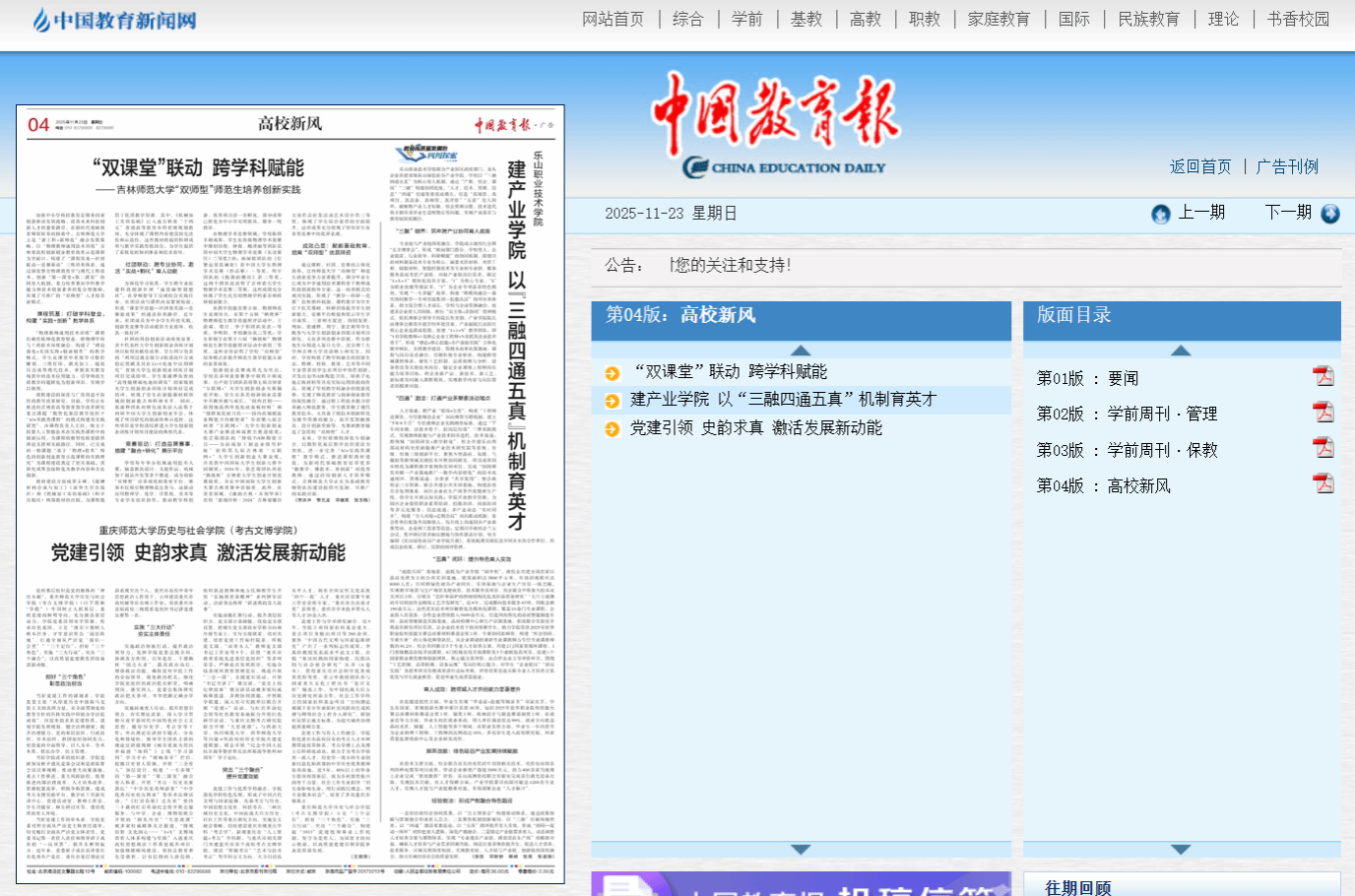 聚焦产业需求、深化产教融合,是职业院校彰显办学特色、提升服务能力的关键之举。sunbet申搏官方网站始终坚守职业教育初心使命,紧扣乐山晶硅光伏、智能制造等重点产业发展方向,以“4517”专业发展思路为引领,重点打造高水平特色专业群,与省内外170余家知名企事业单位建立深度合作关系,通过共建产业学院、共享实训资源、共推技术攻关、共育技能人才,实现了人才培养与产业需求精准对接、教育发展与区域振兴同频共振,积累了丰富的产教融合实践经验。11月23日,《中国教育报》以“建产业学院 以‘三融四通五真’机制育英才”为题,对申搏官网产教融合工作特色和亮点进行了详细报道。