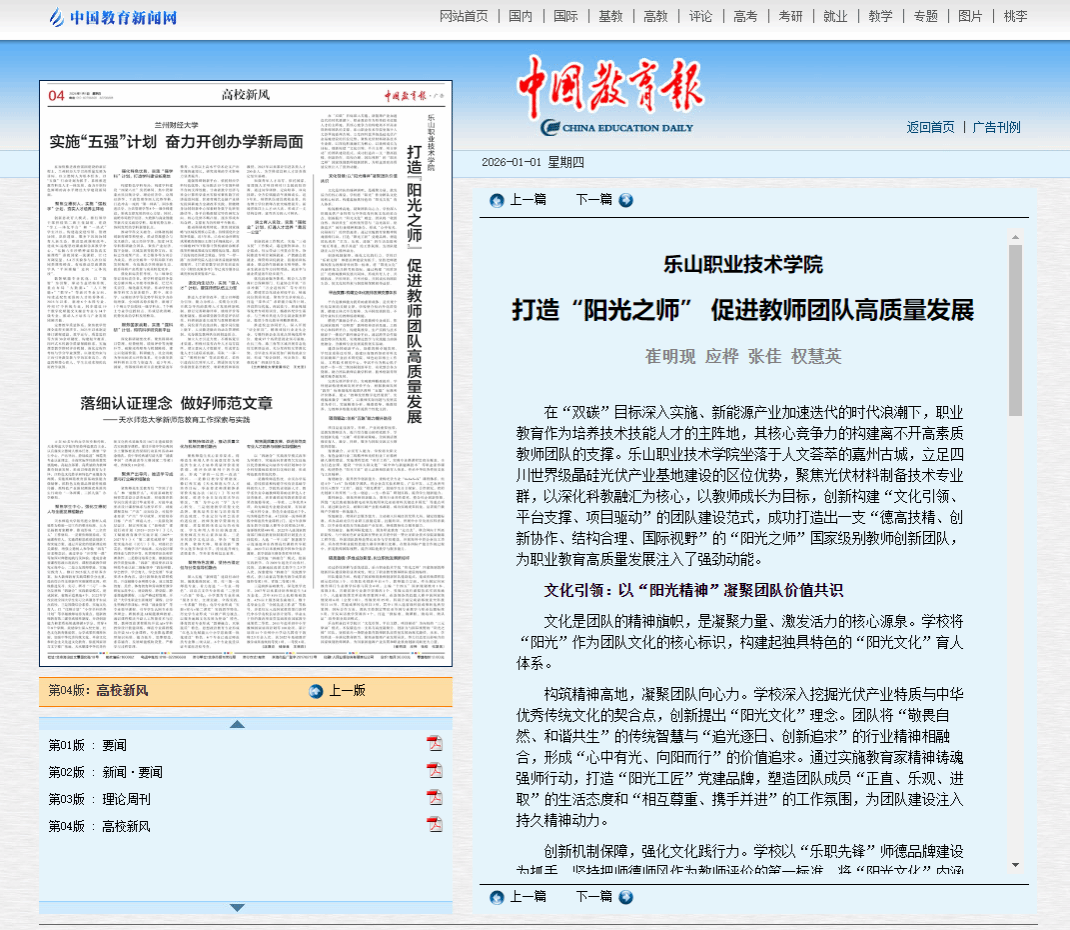 从文化铸魂到平台赋能,从项目驱动到硕果满枝,这支扎根地方产业的教师队伍,正以“德高技精、创新协作”的姿态,书写着职业教育赋能区域发展的鲜活答卷。2026年1月1日,《中国教育报》以“打造‘阳光之师’促进教师团队高质量发展”为题,对sunbet申搏官方网站创新构建“文化引领、平台支撑、项目驱动”的团队建设范式,成功打造出一支“德高技精、创新协作、结构合理、国际视野”的“阳光之师”国家级别教师创新团队进行了详细报道。
