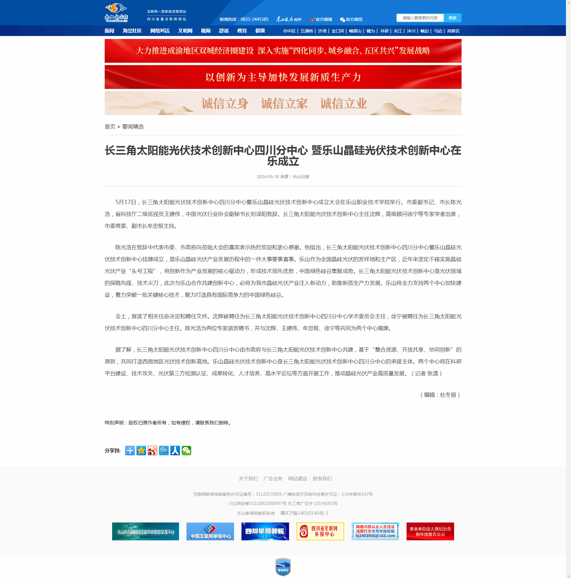 乐山日报:长三角太阳能光伏技术创新中心四川分中心暨乐山晶硅光伏技术创新中心在乐成