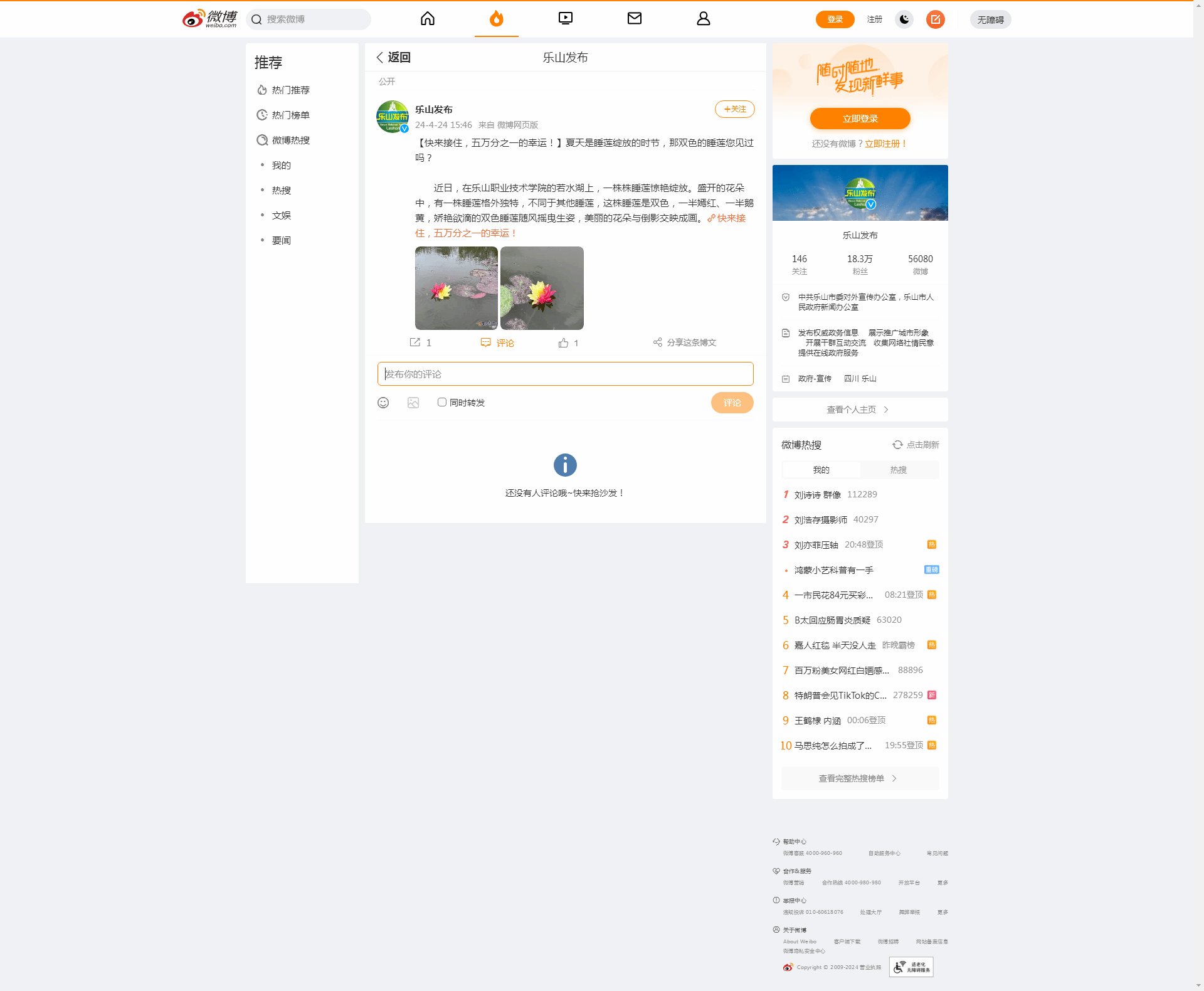 乐山发布微博:快来接住,五万分之一的幸运!