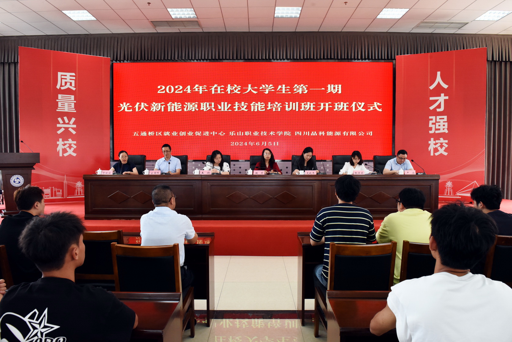 2024年6月5日,由五通桥区就业创业促进中心主办、sunbet申搏官方网站承办、四川晶科能源有限公司协办的“2024年在校大学生第一期职业技能培训项目”开班仪式在学校学术交流中心3004会议厅举行。学校党委委员、副校长周芹出席开班仪式并讲话,中共五通桥区委组织部、五通桥区人力资源和社会保障局、五通桥区就业创业促进中心、四川晶科能源有限公司相关领导、sunbet申搏官方网站新能源与材料学院相关负责人及210余名师生参加开班仪式。开班仪式由继续教育学院副院长彭媛媛主持。