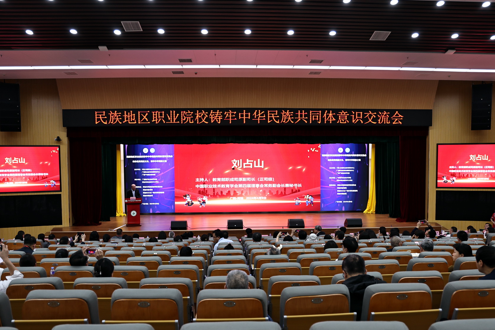 “民族地区职业院校铸牢中华民族共同体意识交流会”由教育部职成司原副司长刘占山主持。教育部民族教育司原一级巡视员葛维威、广西区委党校教授凌经球、中国高教学会职教分会会长周建松、广西社科院民族研究所所长覃娟作主旨报告。在会议“嘉宾沙龙”环节,成定彬应邀同中国职业技术教育杂志社常务副主编席东梅、广西机电职业技术学院党委书记黄小敬、重庆工业职业学院原党委书记王官成、深圳市第二职业技术学校校长王波、河池市职业教育中心学校校长黄丹峻一道,围绕铸牢中华民族共同体意识主题,分享了各单位的经验做法。成定彬就学校利用大学生实践活动铸牢中华民族共同体意识作了经验交流。