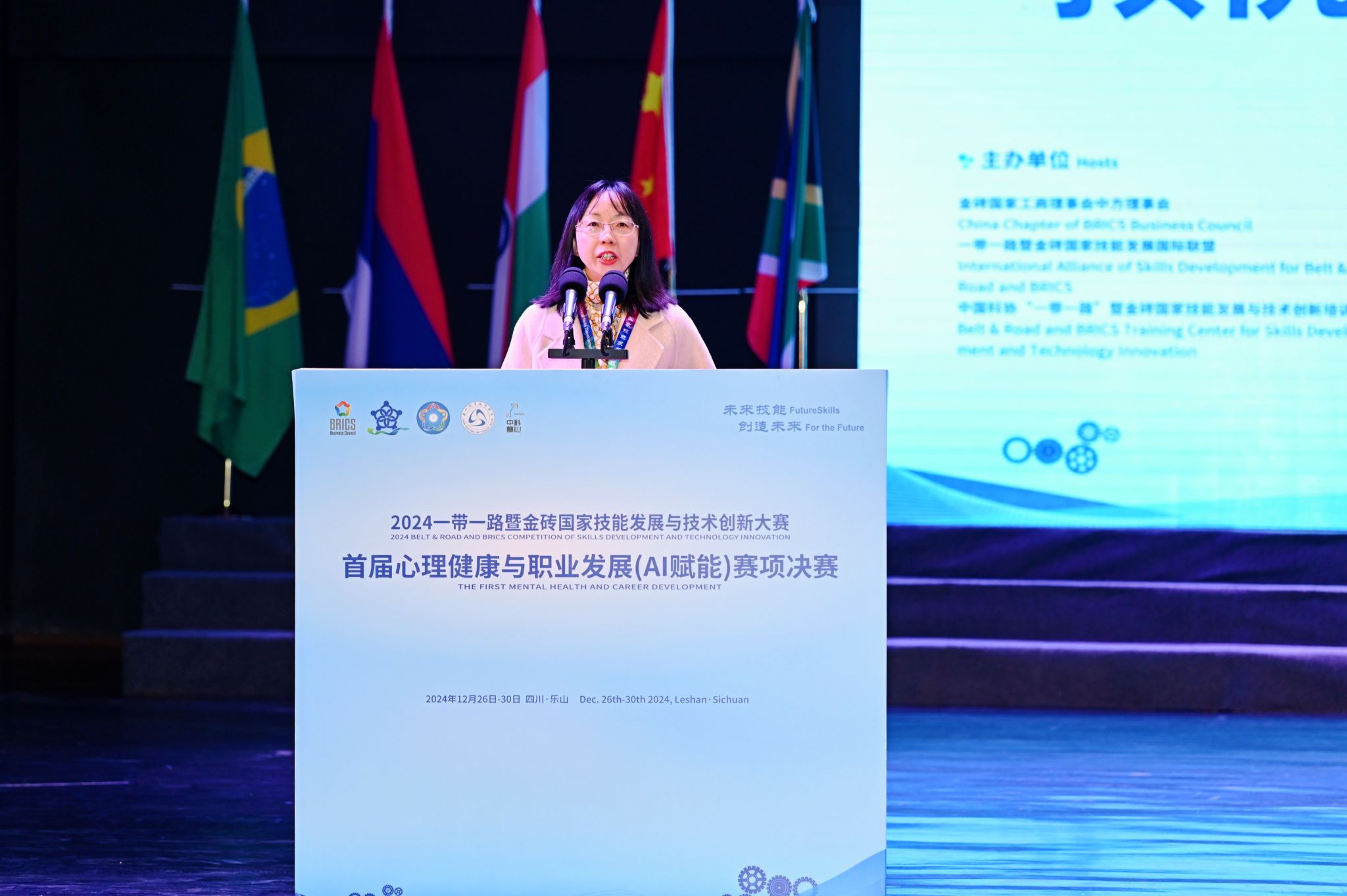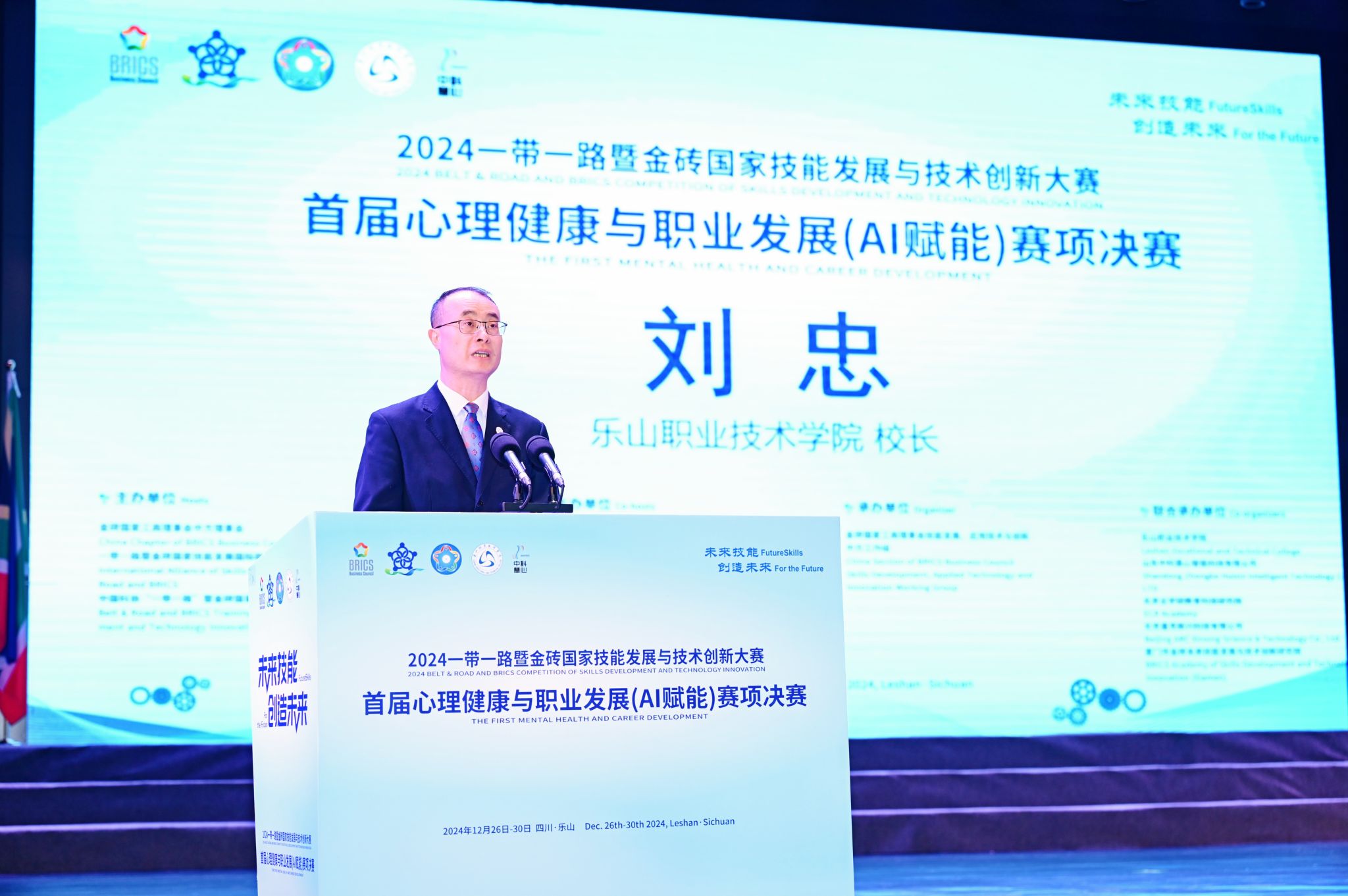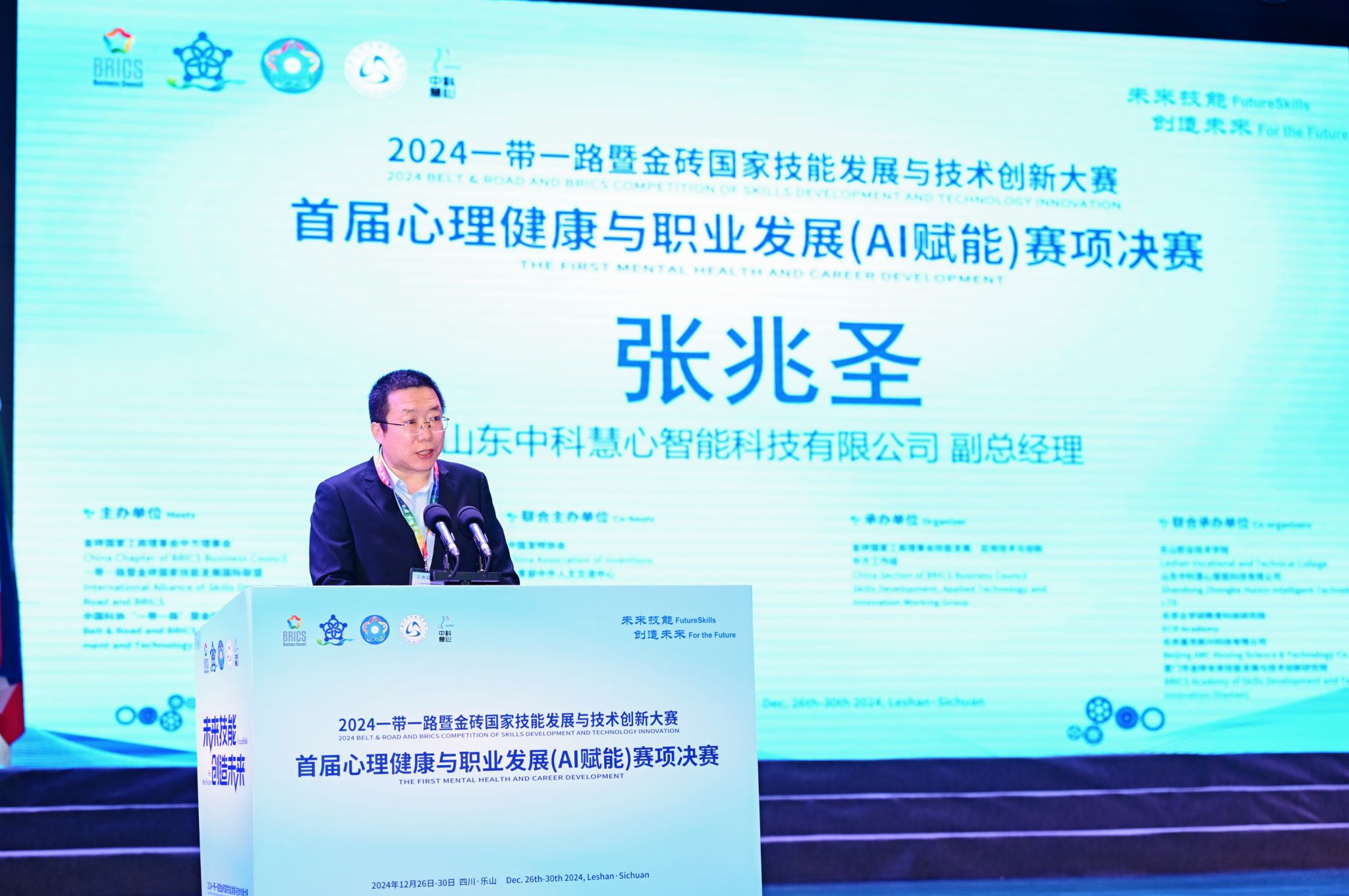 12月27日,“2024‘一带一路’暨金砖国家技能发展与技术创新大赛首届心理健康与职业发展(AI赋能)赛项”决赛在学校开赛。金砖国家技能发展与技术创新大赛组委会执委会国内竞赛办公室主任宋小琴,原国家卫生健康委能力建设与继教中心学术部主任刘晨,北京大学心理学系培训部主任李同归,北京企学研教育科技研究院竞赛合作处主任周海燕,山东中科慧心智能科技有限公司副总经理张兆圣,sunbet申搏官方网站校长刘忠,党委副书记张佳,党委委员、副校长陈元进、封家福、周芹等校内外领导和嘉宾出席开幕式。学校各职能部门(处室)和二级学院负责人、全体专职辅导员老师以及各院校参赛师生现场参加了开赛式。张佳主持开赛式。