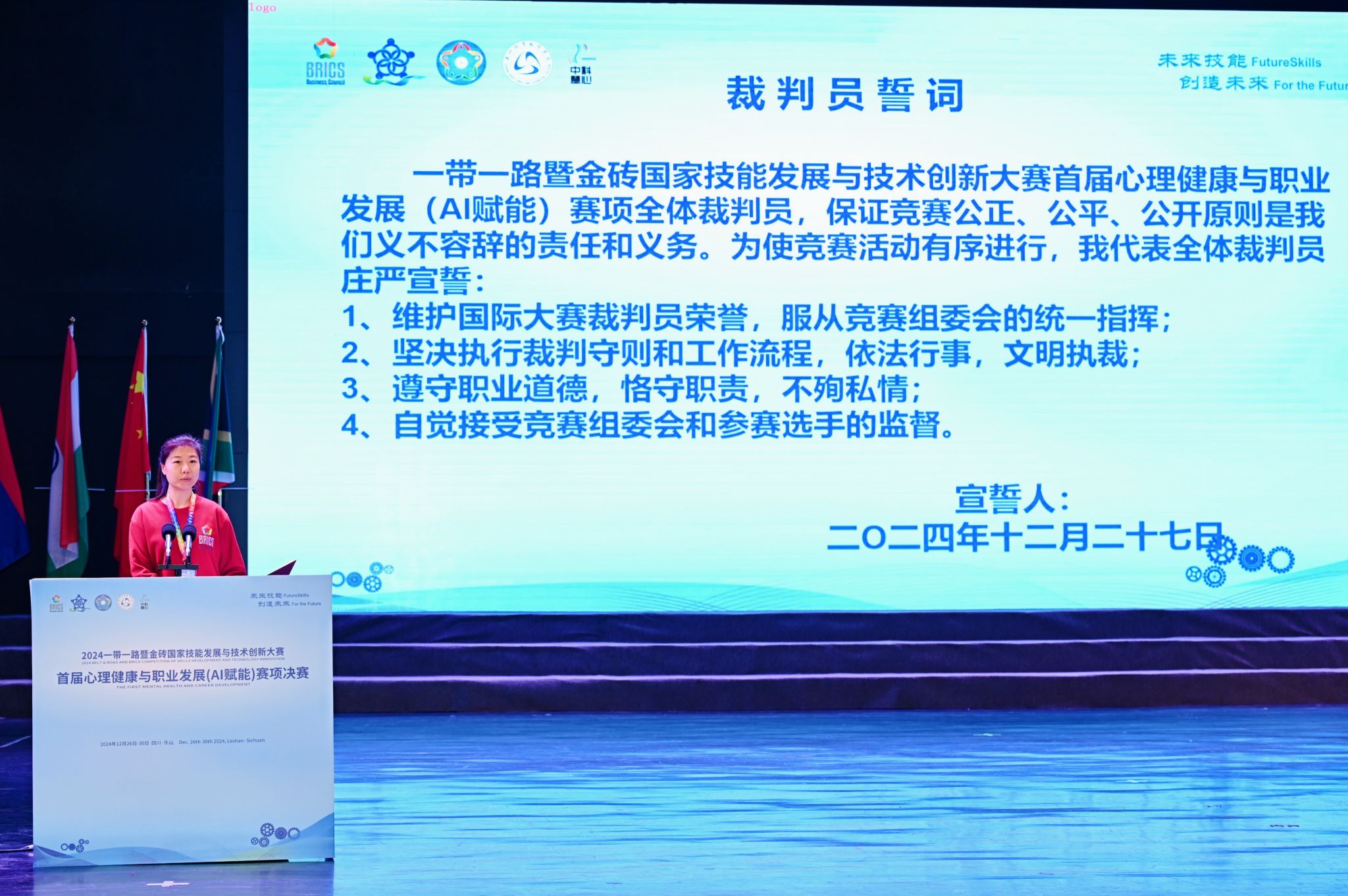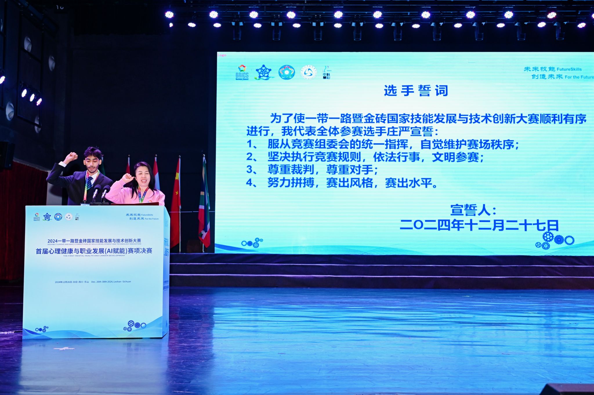 随后,全体裁判和参赛选手先后在裁判长和参赛代表的带领下分别进行宣誓,他们表示,将会严格执行大赛规程制度,遵守大赛纪律,恪守大赛规则,以高度的责任感与使命感,展示出专业素养和技能水平。