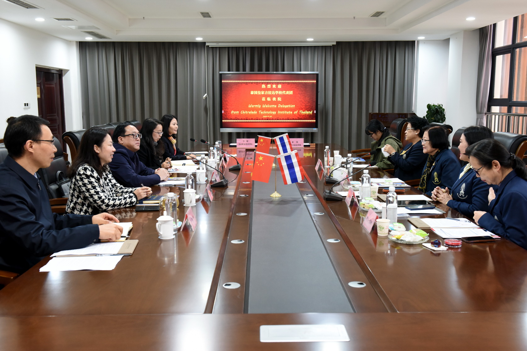 座谈会上,成定彬代表学校对泰国吉拉达技术学院代表团一行的到来表示热烈欢迎,向外宾介绍了学校总体情况与办学历史,回顾了双方在师生交流,学术合作等方面取得的丰硕成果。他表示,今年恰逢两校结好的第十二个年头,希望双方进一步深化合作,在课程开发、合作办学、师生交流、建立“美食文化交流中心”等方面深化合作。