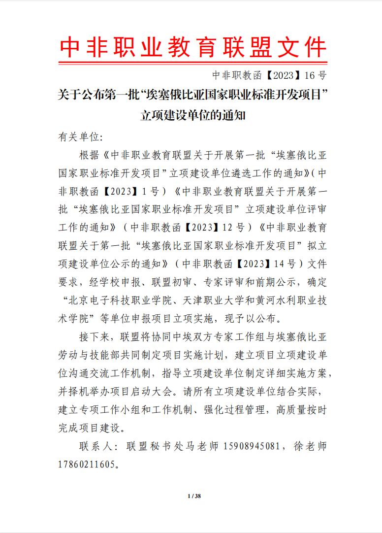 2023年4月23日,中非职业教育联盟公布了第一批“埃塞俄比亚国家职业标准开发项目”立项建设单位。经学校申报、联盟初审、专家评审、前期公示,sunbet申搏官方网站成为护理技术员/工程师3级牵头单位、动物繁育技术员/工程师3级牵头单位以及机械加工技术员/工程师4级参与单位。