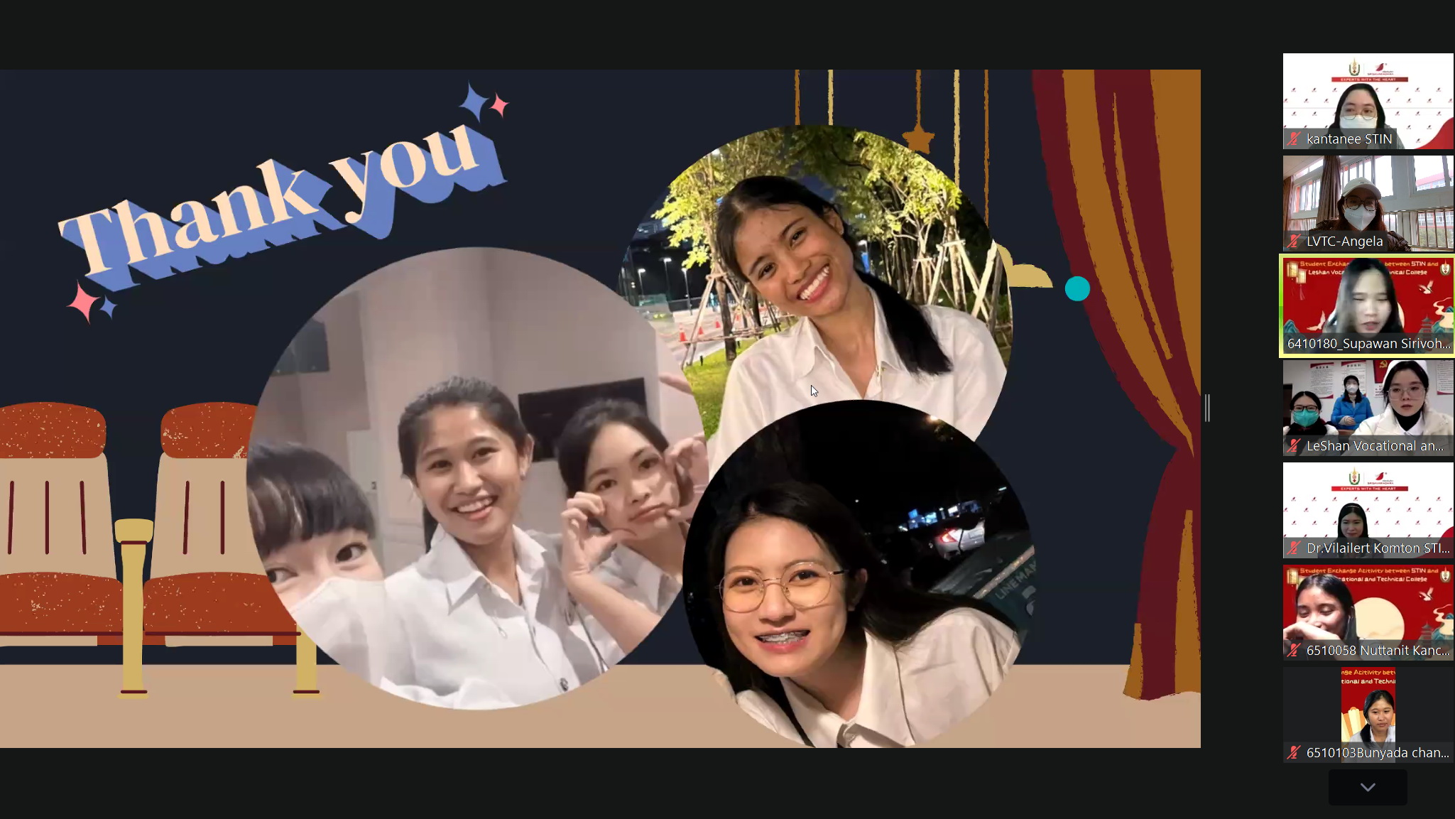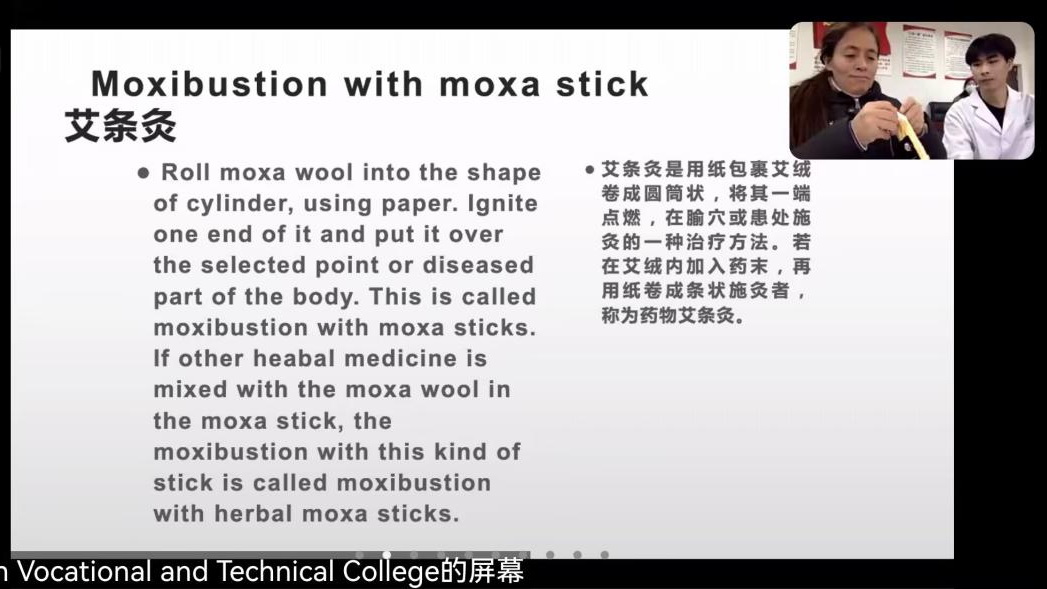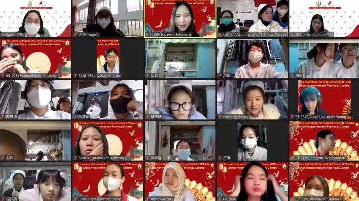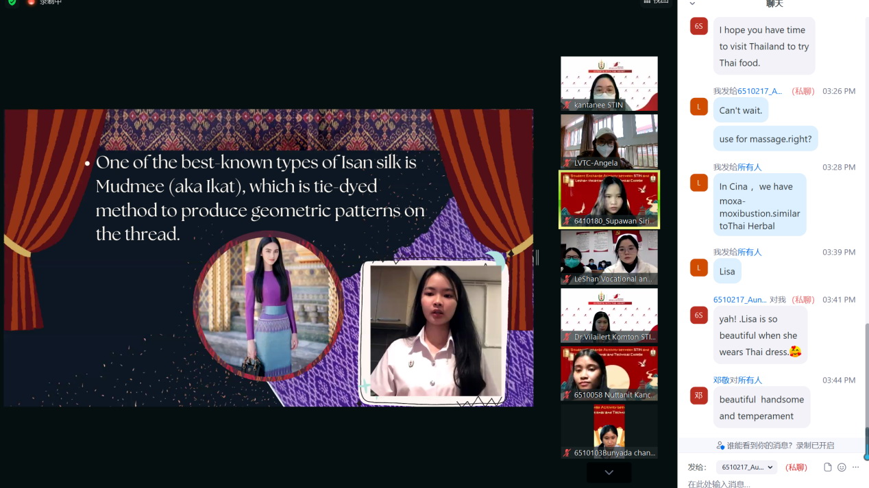 活动第一阶段,由学院护理专业同学从云端带领泰国师生云游乐山,感受乐山人文景观,以护理系为基点,全面介绍学院情况、护理专业学生学习生活情况。杨庆老师通过《苍兰诀》给泰国师生上了一堂有“颜值”的对外汉语课,张鸿宇老师通过实际操作和图文的形式介绍中国传统针灸技艺。第二阶段,泰国师生带领大家领略泰国文化和服饰,参观泰国红十字校园,感受泰国学生学习、生活及实习场景,泰国学生通过视频介绍泰式按摩中香包的制作过程,活动在双方学习泰语中达到高潮,会场气氛热烈,欢声笑语不断。