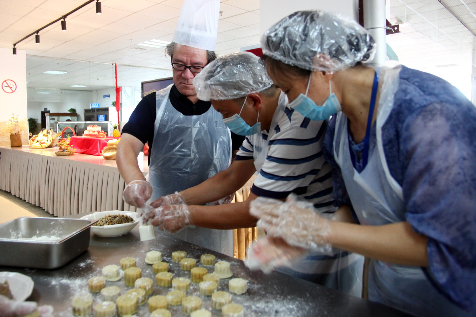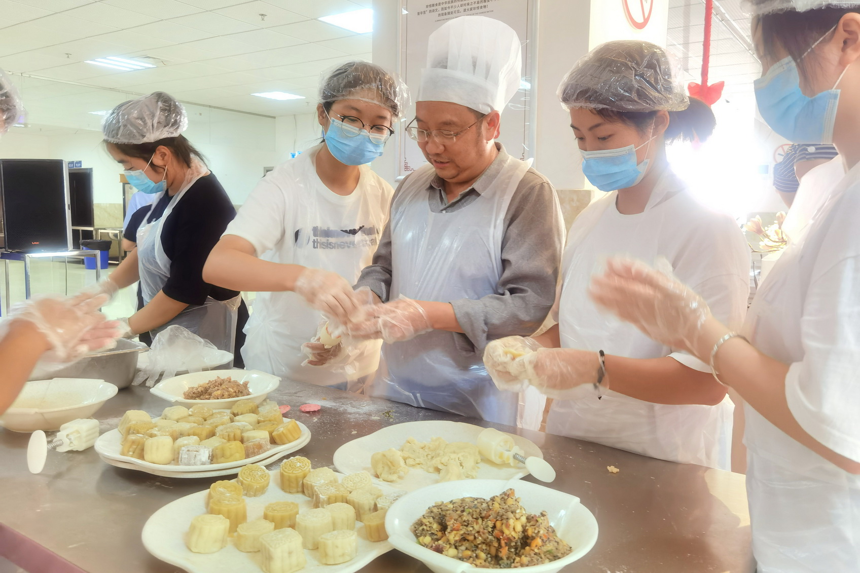 师生分组制作,学院党委副书记、工会主席陈芝海敲响锣鼓后,师生紧张有序手工捣制月饼,独立完成了制作月饼的每道工序,烤制完成之后,由各组师生共同分享劳动成果,品尝自己制作的月饼,交流本次活动收获。