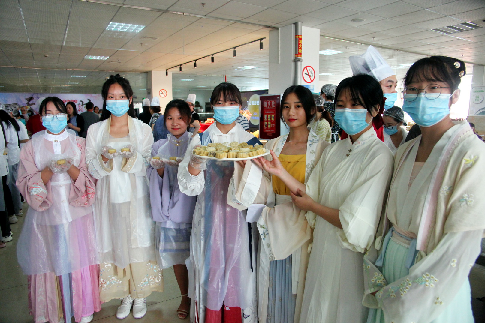 学生释嘉汉服社着装多款汉服走场秀,并朗诵苏东坡《水调歌头》,公课部的何灵老师向中外师生讲授了中秋的文化习俗知识,朗诵了唐李白《峨眉山月歌》,食堂的糕点师傅向中外师生详细讲解了月饼饼面、馅料、器具和烤箱的制作流程,让师生了解了月饼制作食材与步骤。