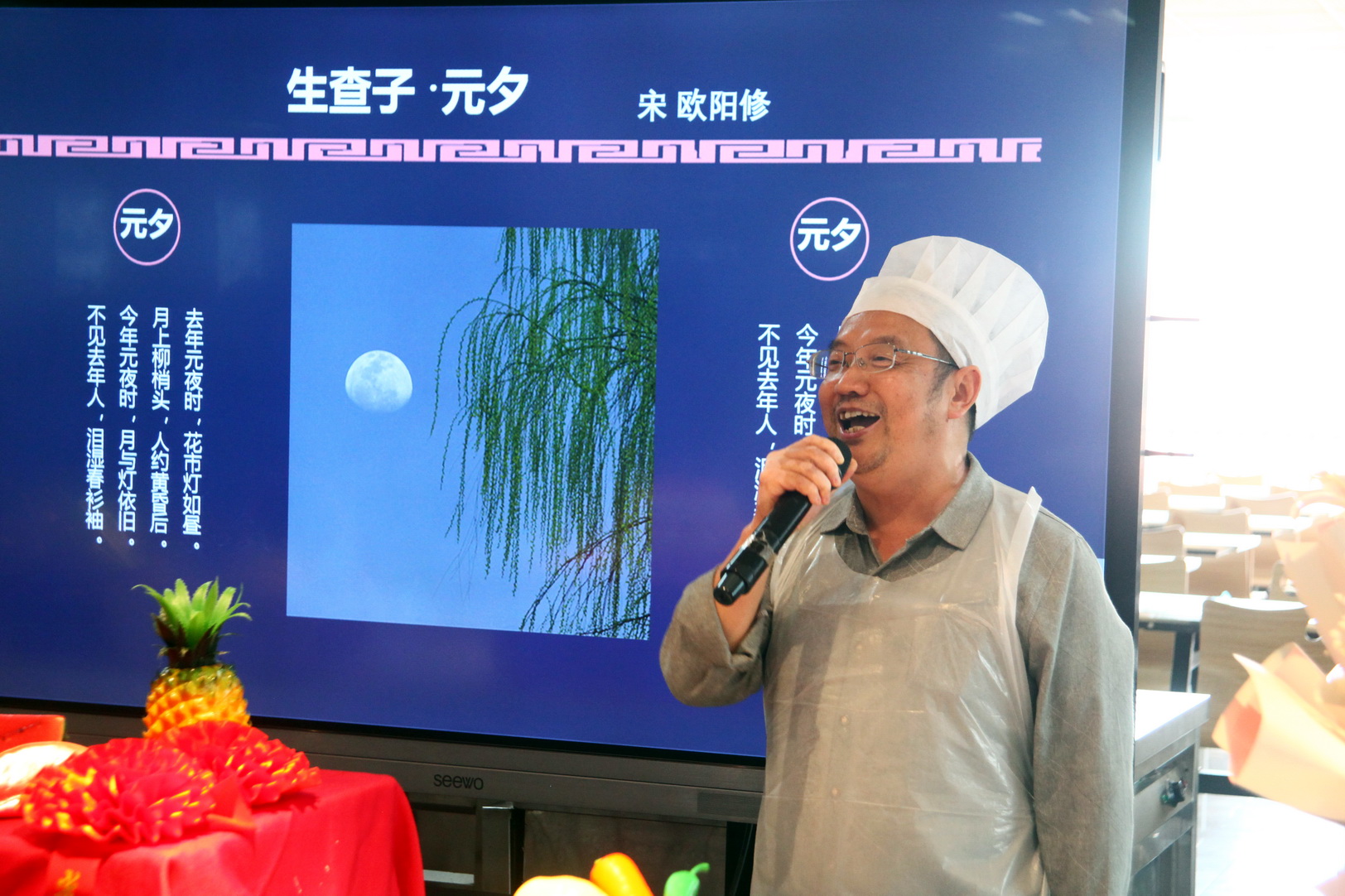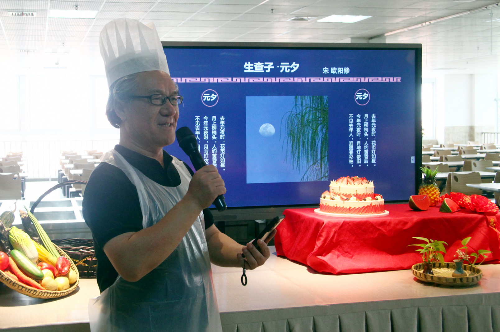 大家制作月饼时,两位院领导即兴为师生表演。学院党委副书记、工会主席陈芝海热情激昂、铿锵有力朗诵了唐李白《将进酒》,学院副院长陈元进字正腔圆、韵味醇厚唱了一曲京剧,为师生活跃了活动气氛,喝彩声响彻食堂。