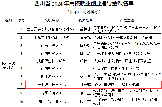 近日,四川省2024年高校就业创业指导金课评选落下帷幕,sunbet申搏官方网站教师林子琪参评课程《探索价值取向,明确职业追求》在全省294堂课程中脱颖而出,获评职业生涯规划组金课。